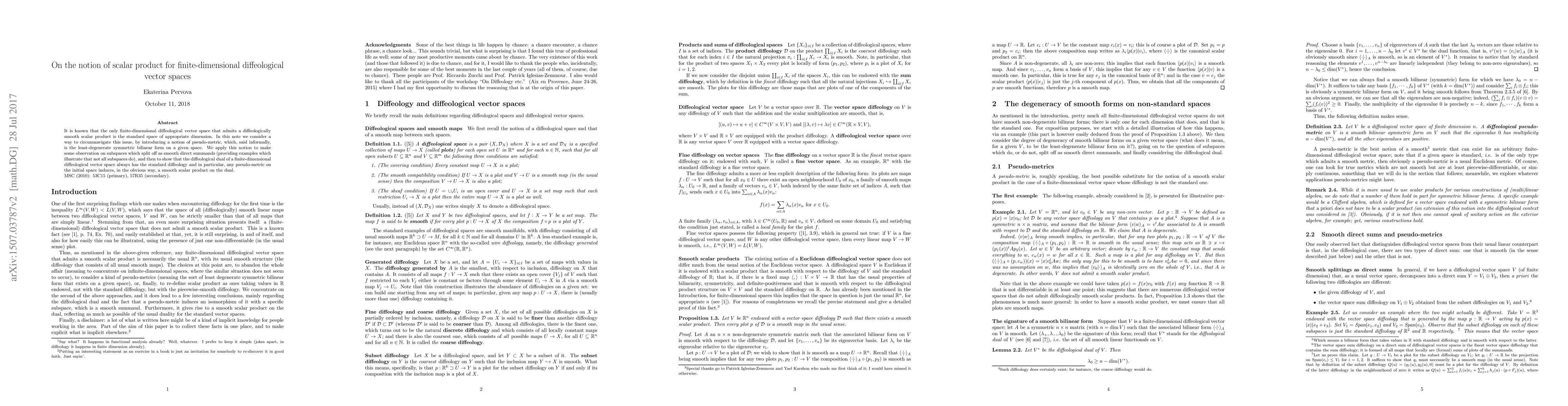 This paper introduces a pseudo-metric as a least-degenerate symmetric bilinear form on finite-dimensional diffeological vector spaces, circumventing the limitation of only the standard space having a smooth scalar product. It also demonstrates that the diffeological dual of such spaces always has the standard diffeology, and that any pseudo-metric on the initial space induces a smooth scalar product on the dual.
