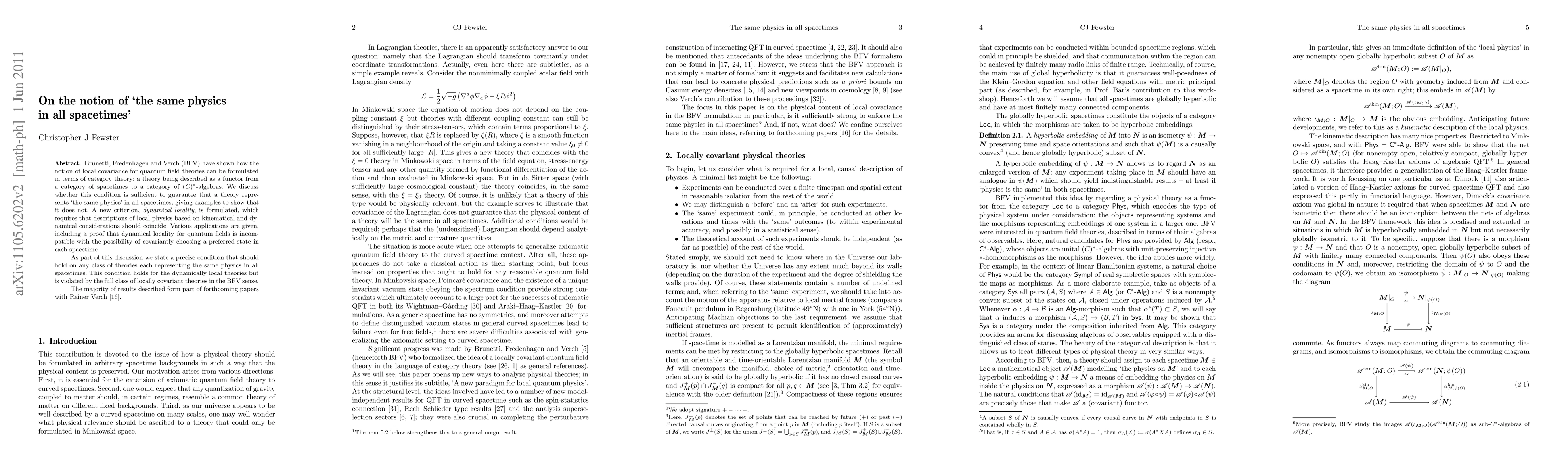 Brunetti, Fredenhagen and Verch (BFV) have shown how the notion of local covariance for quantum field theories can be formulated in terms of category theory: a theory being described as a functor from a category of spacetimes to a category of $(C)^*$-algebras. We discuss whether this condition is sufficient to guarantee that a theory represents `the same physics' in all spacetimes, giving examples to show that it does not. A new criterion, dynamical locality, is formulated, which requires that descriptions of local physics based on kinematical and dynamical considerations should coincide. Various applications are given, including a proof that dynamical locality for quantum fields is incompatible with the possibility of covariantly choosing a preferred state in each spacetime. As part of this discussion we state a precise condition that should hold on any class of theories each representing the same physics in all spacetimes. This condition holds for the dynamically local theories but is violated by the full class of locally covariant theories in the BFV sense. The majority of results described form part of forthcoming papers with Rainer Verch.