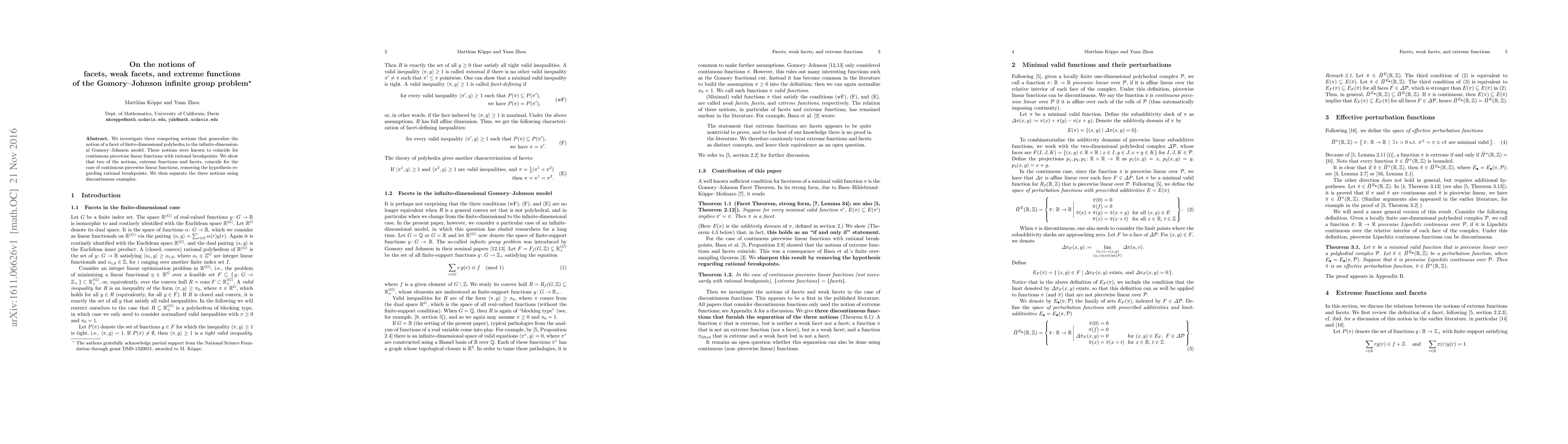 We investigate three competing notions that generalize the notion of a facet of finite-dimensional polyhedra to the infinite-dimensional Gomory-Johnson model. These notions were known to coincide for continuous piecewise linear functions with rational breakpoints. We show that two of the notions, extreme functions and facets, coincide for the case of continuous piecewise linear functions, removing the hypothesis regarding rational breakpoints. We then separate the three notions using discontinuous examples.