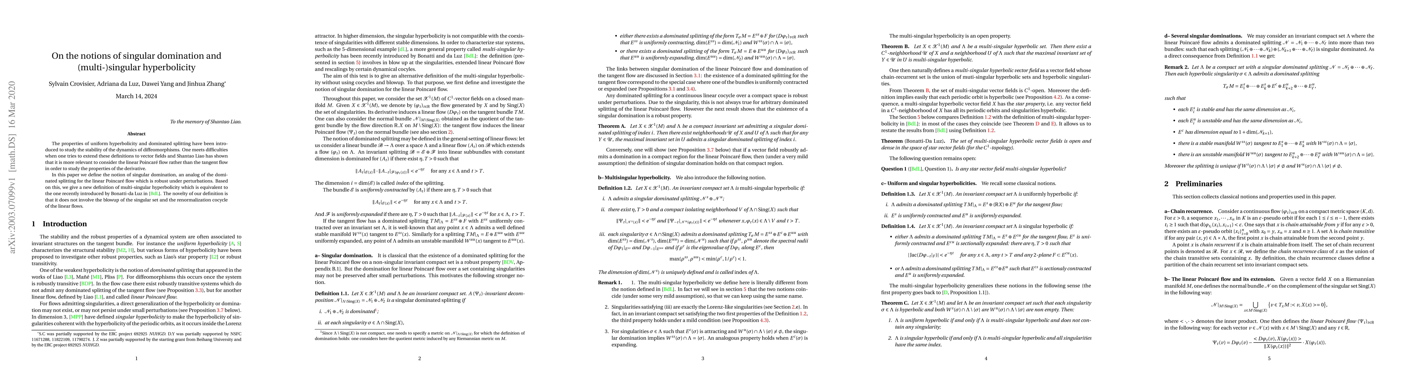 The properties of uniform hyperbolicity and dominated splitting have been introduced to study the stability of the dynamics of diffeomorphisms. One meets difficulties when one tries to extend these definitions to vector fields and Shantao Liao has shown that it is more relevant to consider the linear Poincar\'e flow rather than the tangent flow in order to study the properties of the derivative. In this paper we define the notion of singular domination, an analog of the dominated splitting for the linear Poincar\'e flow which is robust under perturbations. Based on this, we give a new definition of multi-singular hyperbolicity which is equivalent to the one recently introduced by Bonatti-da Luz. The novelty of our definition is that it does not involve the blowup of the singular set and the renormalization cocycle of the linear flows.