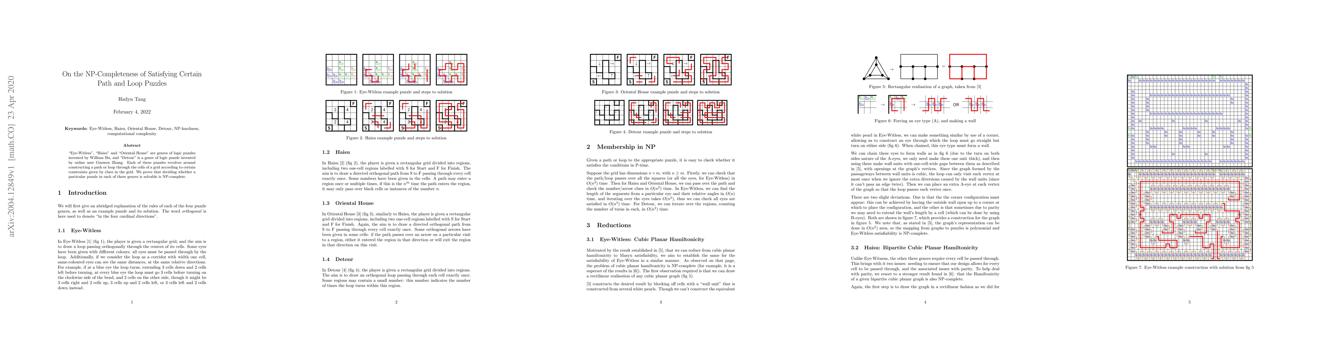 "Eye-Witless", "Haisu" and "Oriental House" are genres of logic puzzles invented by William Hu, and "Detour" is a genre of logic puzzle invented by online user Guowen Zhang. Each of these puzzles revolves around constructing a path or loop through the cells of a grid according to certain constraints given by clues in the grid. We prove that deciding whether a particular puzzle in each of these genres is solvable is NP-complete.