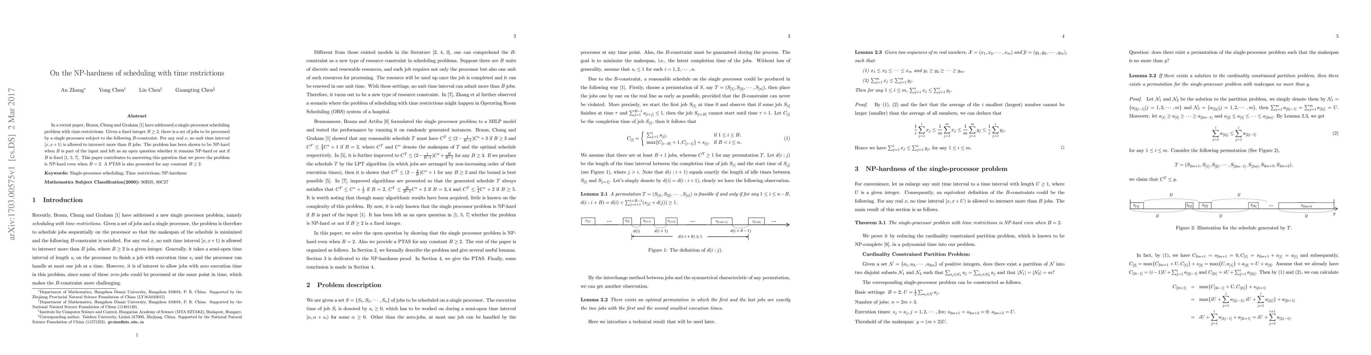In a recent paper, Braun, Chung and Graham [1] have addressed a single-processor scheduling problem with time restrictions. Given a fixed integer $B \geq 2$, there is a set of jobs to be processed by a single processor subject to the following B-constraint. For any real $x$, no unit time interval $[x, x+1)$ is allowed to intersect more than $B$ jobs. The problem has been shown to be NP-hard when $B$ is part of the input and left as an open question whether it remains NP-hard or not if $B$ is fixed [1, 5, 7]. This paper contributes to answering this question that we prove the problem is NP-hard even when $B=2$. A PTAS is also presented for any constant $B \geq 2$.