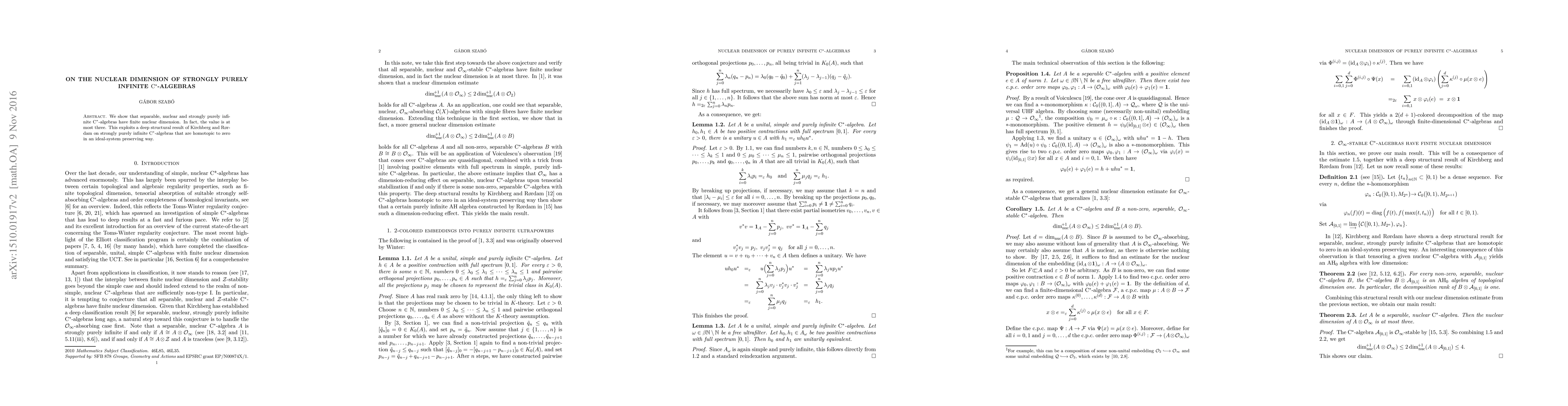 Summary: This paper demonstrates that separable, nuclear, and strongly purely infinite C*-algebras possess finite nuclear dimension, with the upper limit being three, utilizing a structural theorem by Kirchberg and R{\o}rdam.