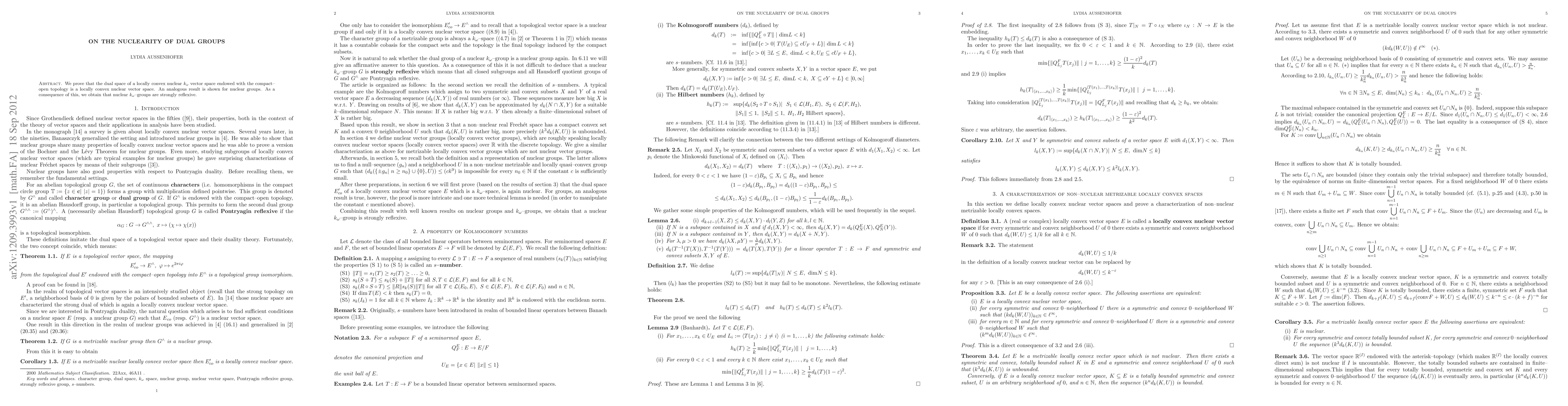 We prove that the dual space of a locally convex nuclear $k_\omega$ vector space endowed with the compact--open topology is a locally convex nuclear vector space. An analogous result is shown for nuclear groups. As a consequence of this, we obtain that nuclear $k_\omega$--groups are strongly reflexive.