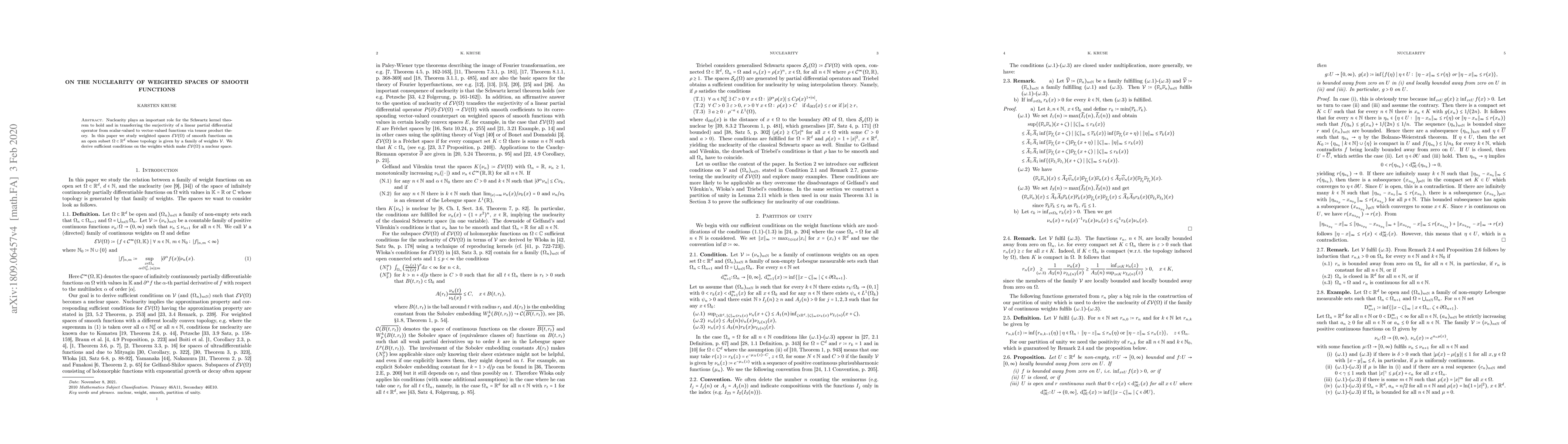 This paper explores conditions for weighted spaces of smooth functions to be nuclear, enabling the application of the Schwartz kernel theorem in tensor product theory. It provides sufficient criteria for weights that make these spaces nuclear.