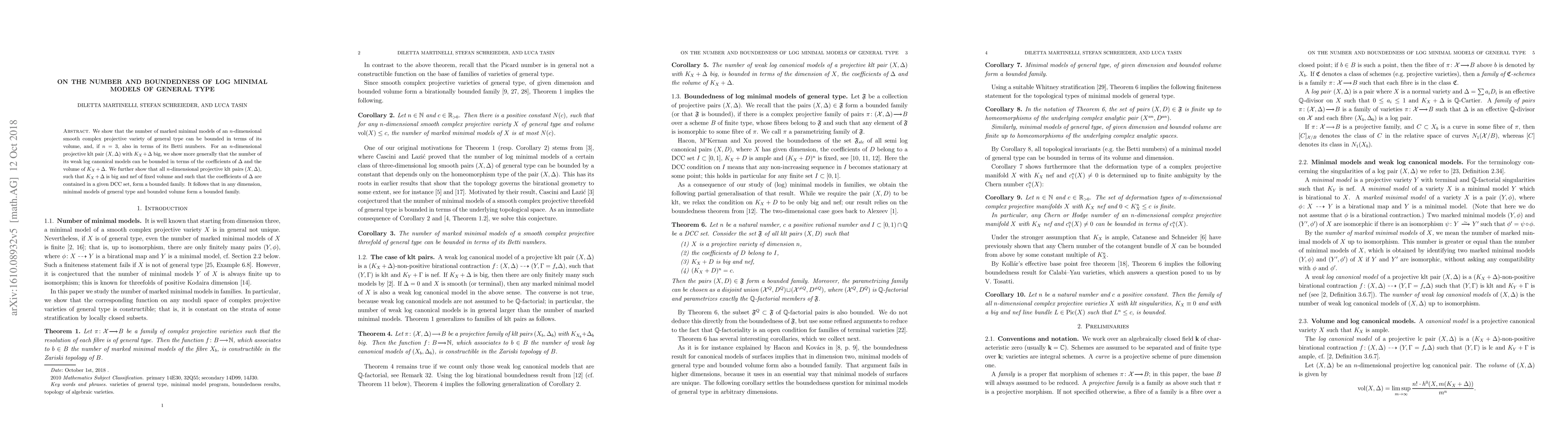 We show that the number of marked minimal models of an n-dimensional smooth complex projective variety of general type can be bounded in terms of its volume, and, if n=3, also in terms of its Betti numbers. For an n-dimensional projective klt pair (X,D) with $K_X+D$ big, we show more generally that the number of its weak log canonical models can be bounded in terms of the coefficients of D and the volume of $K_X+D$. We further show that all n-dimensional projective klt pairs (X,D), such that $K_X+D$ is big and nef of fixed volume and such that the coefficients of D are contained in a given DCC set, form a bounded family. It follows that in any dimension, minimal models of general type and bounded volume form a bounded family.