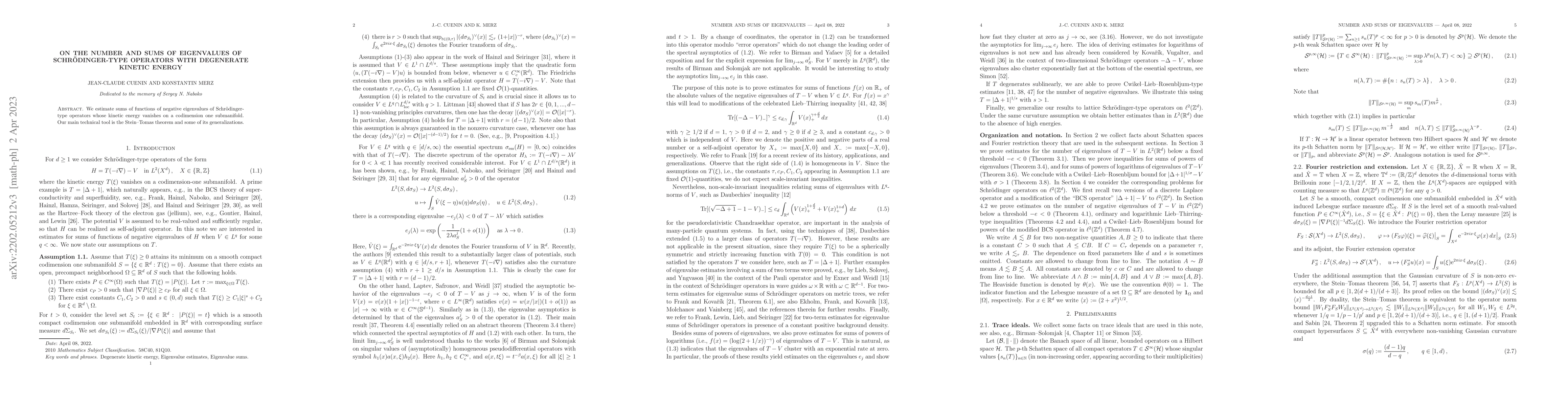 We estimate sums of functions of negative eigenvalues of Schr\"odinger-type operators whose kinetic energy vanishes on a codimension one submanifold. Our main technical tool is the Stein-Tomas theorem and some of its generalizations.
