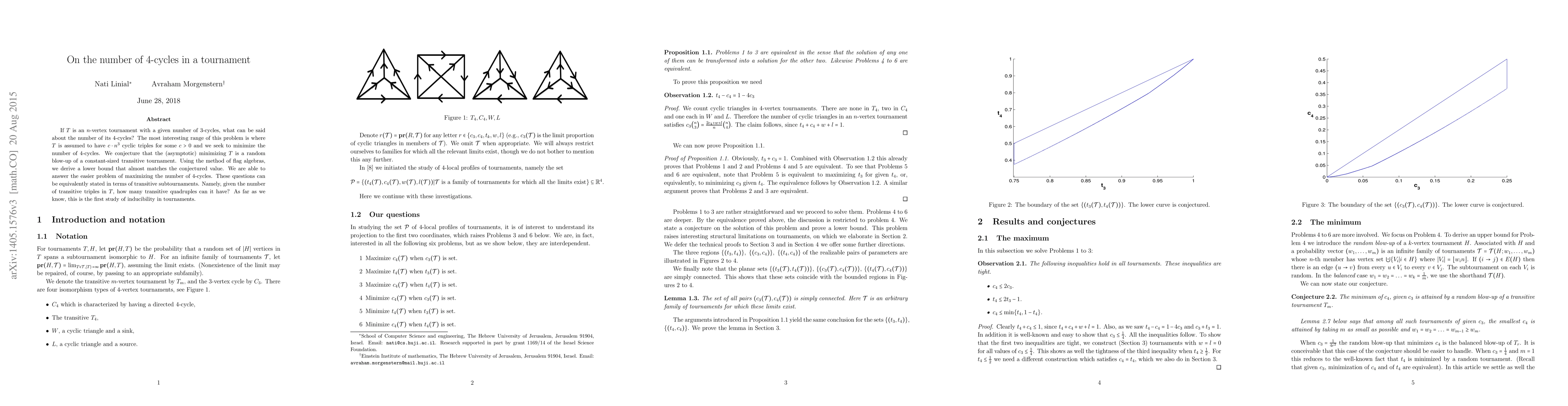 This paper investigates the relationship between the number of 3-cycles and 4-cycles in tournaments, proposing that minimizing 4-cycles under a fixed number of 3-cycles is achieved by a random blow-up of a transitive tournament. It uses flag algebras to derive a lower bound for the number of 4-cycles, nearly matching the conjectured value.