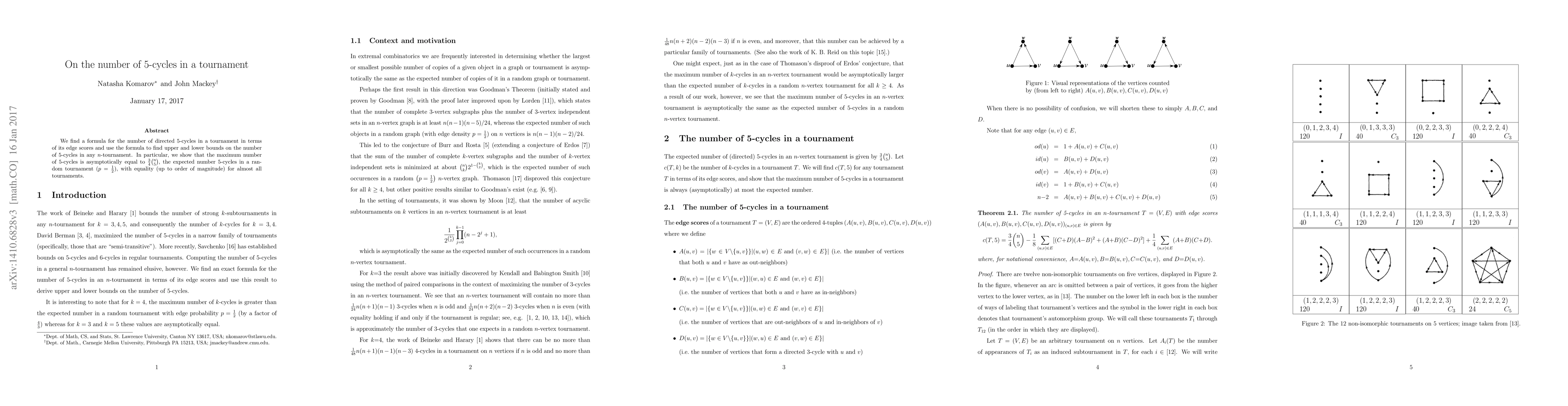 This paper provides an exact formula for the number of directed 5-cycles in a tournament based on its edge score sequence, and uses this to establish upper and lower bounds on 5-cycles in any $n$-tournament, showing that almost all $n$-tournaments achieve the maximum number of 5-cycles.