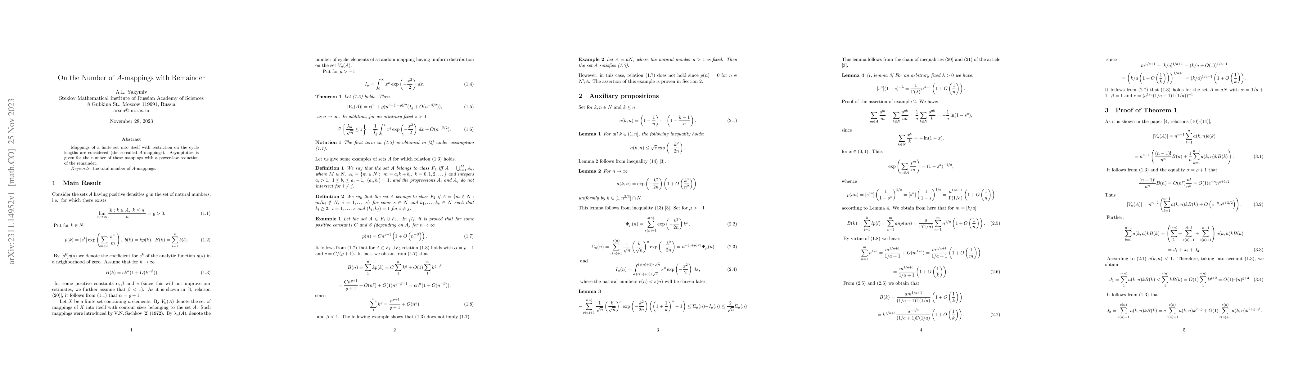 Mappings of a finite set into itself with restriction on the cycle lengths are considered (the so-called A-mappings). Asymptotics is given for the number of these mappings with a power-law reduction of the remainder.