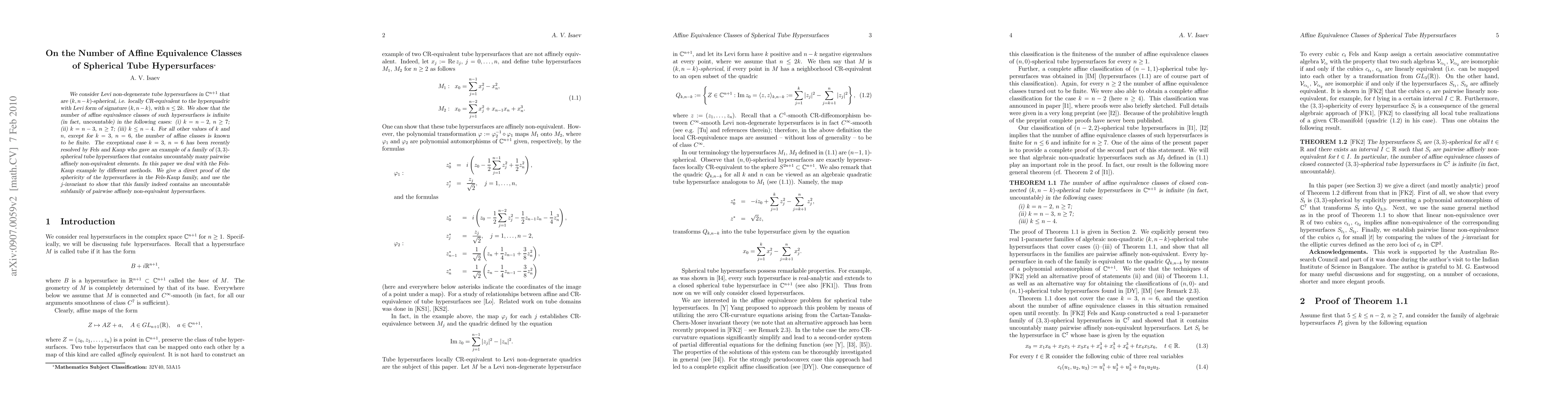 This paper investigates the number of affine equivalence classes of $(k,n-k)$-spherical tube hypersurfaces in $\mathbb{C}^{n+1}$, showing that they are uncountably infinite for specific values of $k$ and $n$. It also resolves the exceptional case $k=3$, $n=6$ using different methods to confirm the uncountability of a family of such hypersurfaces.