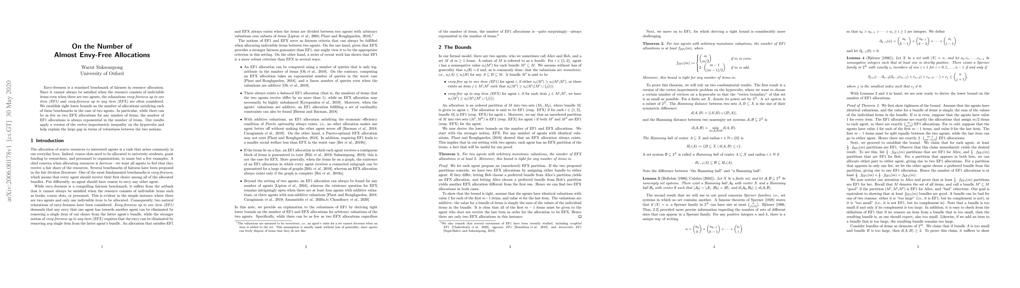 Envy-freeness is a standard benchmark of fairness in resource allocation. Since it cannot always be satisfied when the resource consists of indivisible items even when there are two agents, the relaxations envy-freeness up to one item (EF1) and envy-freeness up to any item (EFX) are often considered. We establish tight lower bounds on the number of allocations satisfying each of these benchmarks in the case of two agents. In particular, while there can be as few as two EFX allocations for any number of items, the number of EF1 allocations is always exponential in the number of items. Our results apply a version of the vertex isoperimetric inequality on the hypercube and help explain the large gap in terms of robustness between the two notions.