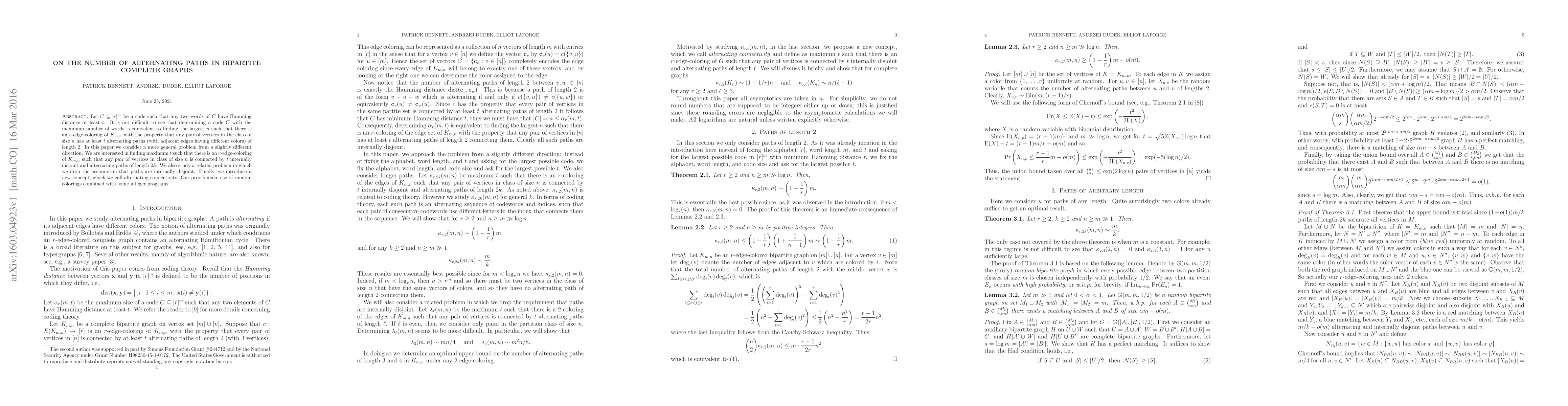 Let $C \subseteq [r]^m$ be a code such that any two words of $C$ have Hamming distance at least $t$. It is not difficult to see that determining a code $C$ with the maximum number of words is equivalent to finding the largest $n$ such that there is an $r$-edge-coloring of $K_{m, n}$ with the property that any pair of vertices in the class of size $n$ has at least $t$ alternating paths (with adjacent edges having different colors) of length $2$. In this paper we consider a more general problem from a slightly different direction. We are interested in finding maximum $t$ such that there is an $r$-edge-coloring of $K_{m,n}$ such that any pair of vertices in class of size $n$ is connected by $t$ internally disjoint and alternating paths of length $2k$. We also study a related problem in which we drop the assumption that paths are internally disjoint. Finally, we introduce a new concept, which we call alternating connectivity. Our proofs make use of random colorings combined with some integer programs.