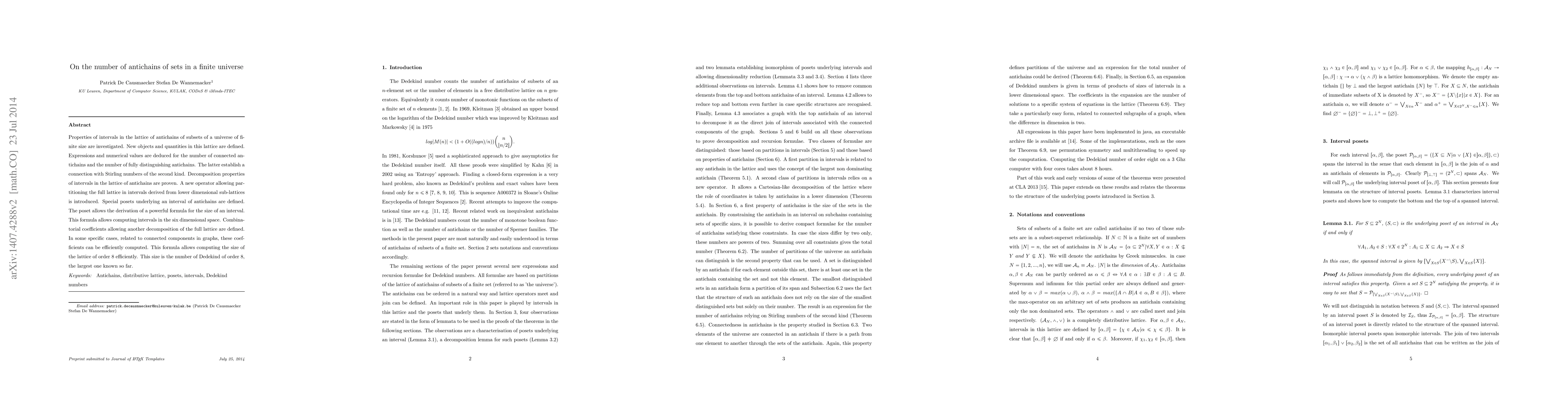 Properties of intervals in the lattice of antichains of subsets of a universe of finite size are investigated. New objects and quantities in this lattice are defined. Expressions and numerical values are deduced for the number of connected antichains and the number of fully distinguishing antichains. The latter establish a connection with Stirling numbers of the second kind. Decomposition properties of intervals in the lattice of antichains are proven. A new operator allowing partitioning the full lattice in intervals derived from lower dimensional sub-lattices is introduced. Special posets underlying an interval of antichains are defined. The poset allows the derivation of a powerful formula for the size of an interval. This formula allows computing intervals in the six dimensional space. Combinatorial coefficients allowing another decomposition of the full lattice are defined. In some specific cases, related to connected components in graphs, these coefficients can be efficiently computed. This formula allows computing the size of the lattice of order 8 efficiently. This size is the number of Dedekind of order 8, the largest one known so far.