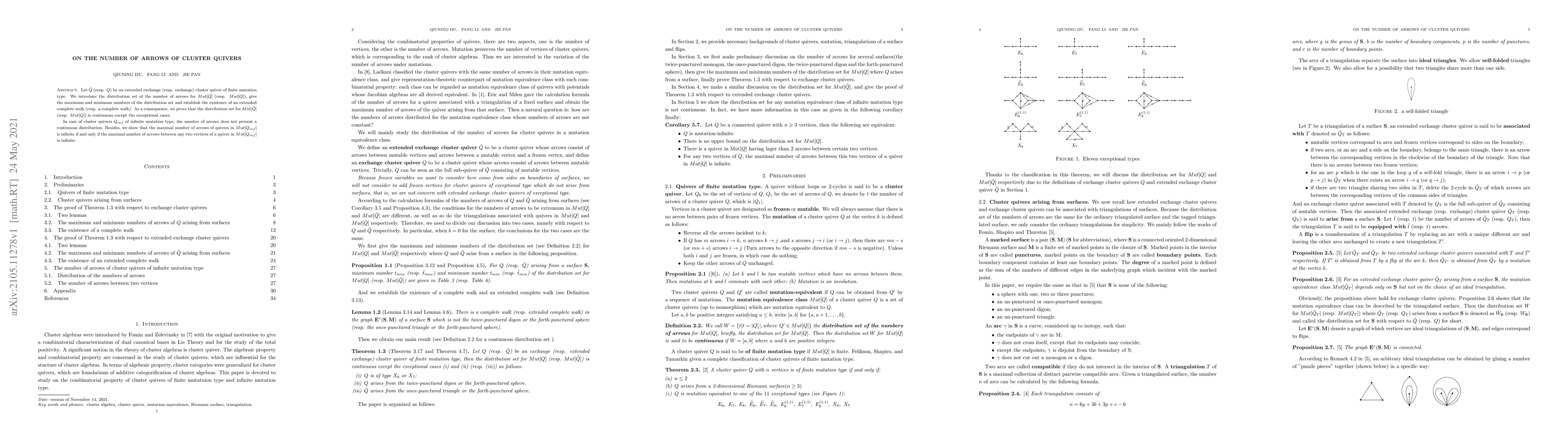 This paper investigates the distribution of arrow counts in cluster quivers with finite and infinite mutation types, finding continuous distributions except for certain exceptional cases, with implications for understanding quiver properties.