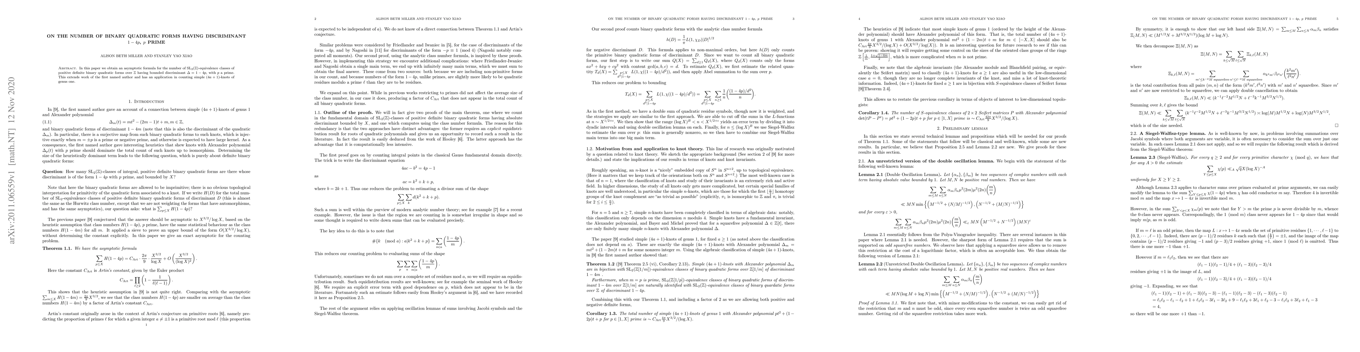 This paper provides an asymptotic formula for the number of positive definite binary quadratic forms with discriminant $1-4p$ where $p$ is a prime, extending previous work and applying to the counting of simple $(4a+1)$-knots of genus one.