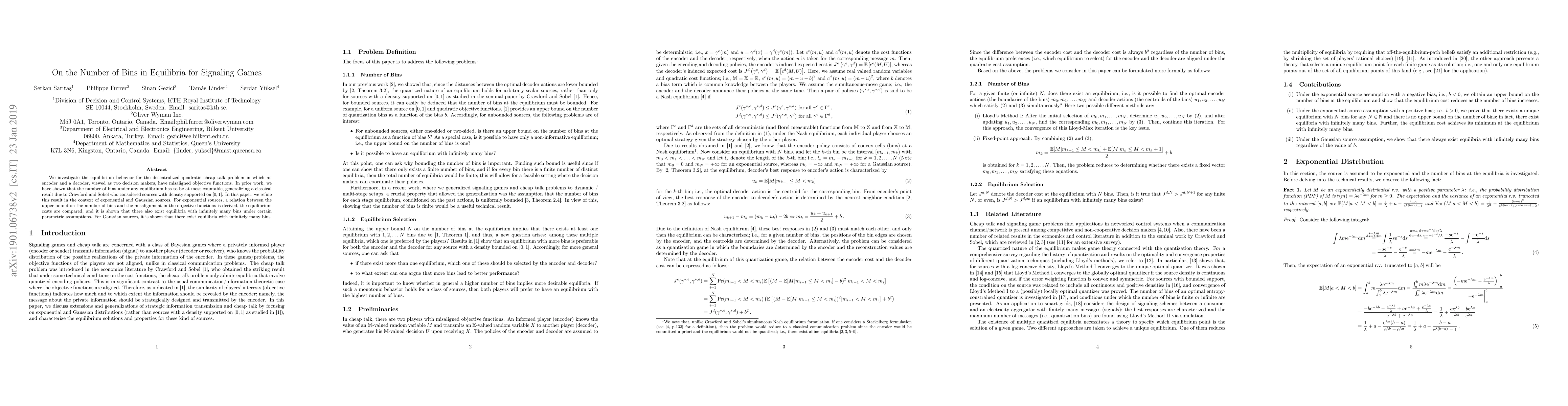 We investigate the equilibrium behavior for the decentralized quadratic cheap talk problem in which an encoder and a decoder, viewed as two decision makers, have misaligned objective functions. In prior work, we have shown that the number of bins under any equilibrium has to be at most countable, generalizing a classical result due to Crawford and Sobel who considered sources with density supported on $[0,1]$. In this paper, we refine this result in the context of exponential and Gaussian sources. For exponential sources, a relation between the upper bound on the number of bins and the misalignment in the objective functions is derived, the equilibrium costs are compared, and it is shown that there also exist equilibria with infinitely many bins under certain parametric assumptions. For Gaussian sources, it is shown that there exist equilibria with infinitely many bins.