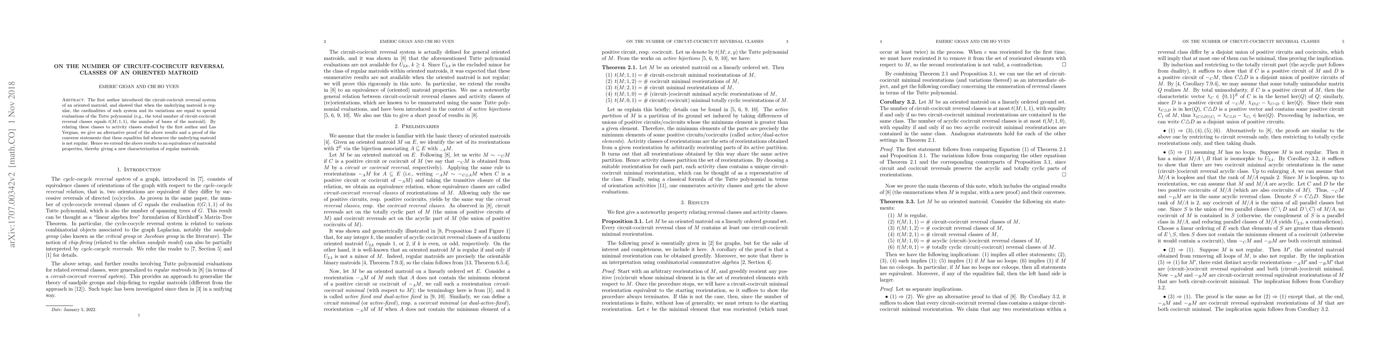 Summary: This paper studies the circuit-cocircuit reversal classes of oriented matroids and shows that their count equals the number of bases of the underlying matroid when the matroid is regular. It provides an alternative proof and proves that this equality fails for non-regular matroids, thus offering a new characterization of regular matroids.