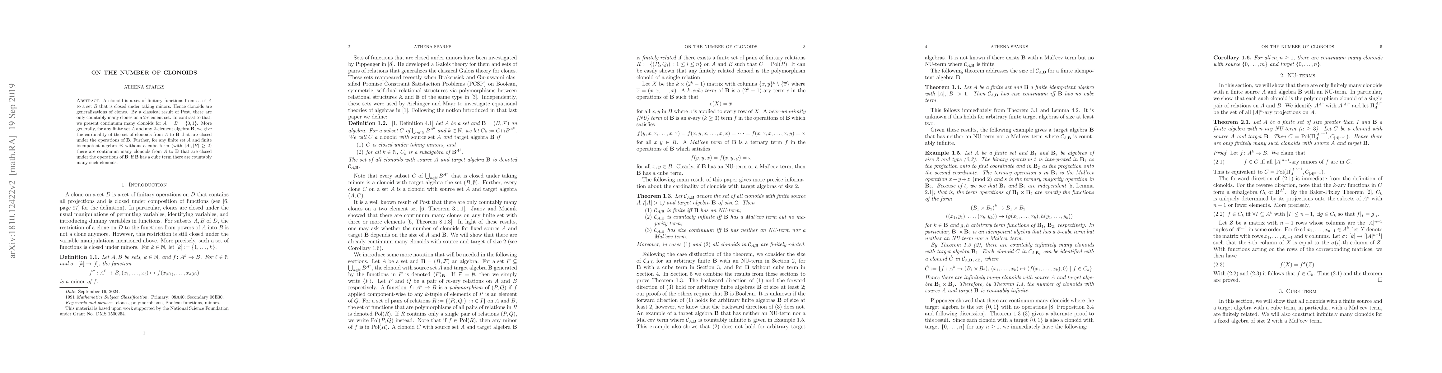 The research explores the number of clonoids, which are sets of finitary functions closed under taking minors, generalizing clones. It contrasts the countable many clones on a 2-element set with presenting continuum many clonoids for A = B = {0,1}.