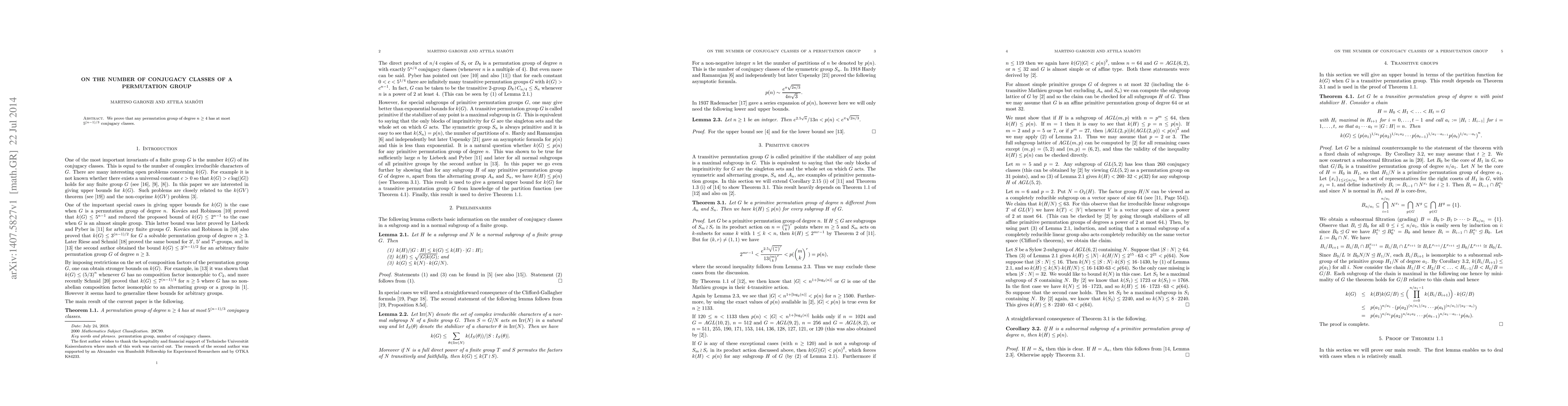 The paper's main technical contribution is the proof that any permutation group of degree n ≥ 4 has at most 5^((n-1)/3) conjugacy classes, along with detailed analysis for primitive and transitive permutation groups.