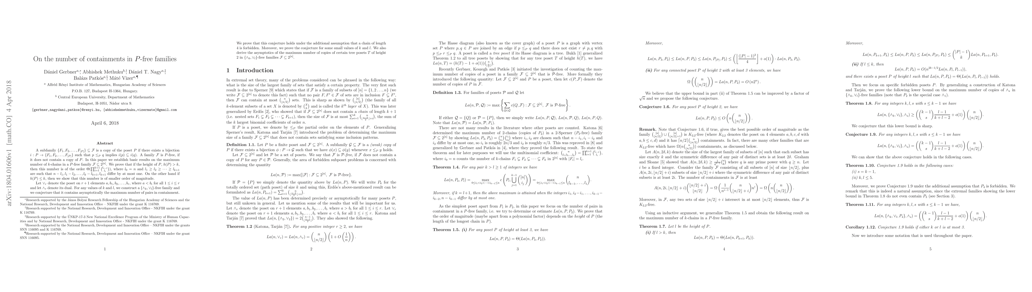 A subfamily $\{F_1,F_2,\dots,F_{|P|}\}\subseteq \mathcal F$ is a copy of the poset $P$ if there exists a bijection $i:P\rightarrow \{F_1,F_2,\dots,F_{|P|}\}$ such that $p\le_P q$ implies $i(p)\subseteq i(q)$. A family $\mathcal F$ is $P$-free, if it does not contain a copy of $P$. In this paper we establish basic results on the maximum possible number of $k$-chains in a $P$-free family $\mathcal F\subseteq 2^{[n]}$. We prove that if the height of $P$, $h(P) > k$, then this number is of the order $\Theta(\prod_{i=1}^{k+1}\binom{l_{i-1}}{l_i})$, where $l_0=n$ and $l_1\ge l_2\ge \dots \ge l_{k+1}$ are such that $n-l_1,l_1-l_2,\dots, l_k-l_{k+1},l_{k+1}$ differ by at most one. On the other hand if $h(P)\le k$, then we show that this number is of smaller order of magnitude. Let $\vee_r$ denote the poset on $r+1$ elements $a, b_1, b_2, \ldots, b_r$, where $a < b_i$ for all $1 \le i \le r$ and let $\wedge_r$ denote its dual. For any values of $k$ and $l$, we construct a $\{\wedge_k,\vee_l\}$-free family and we conjecture that it contains asymptotically the maximum number of pairs in containment. We prove that this conjecture holds under the additional assumption that a chain of length 4 is forbidden. Moreover, we prove the conjecture for some small values of $k$ and $l$. We also derive the asymptotics of the maximum number of copies of certain tree posets $T$ of height 2 in $\{\wedge_k,\vee_l\}$-free families $\mathcal F \subseteq 2^{[n]}$.