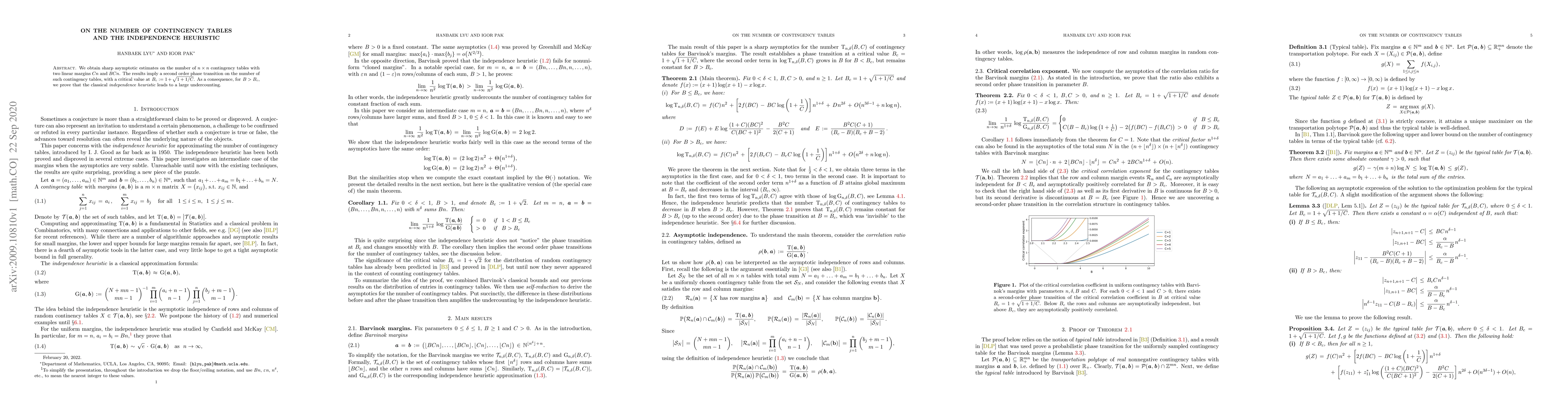 We obtain sharp asymptotic estimates on the number of $n \times n$ contingency tables with two linear margins $Cn$ and $BCn$. The results imply a second order phase transition on the number of such contingency tables, with a critical value at \ts $B_{c}:=1 + \sqrt{1+1/C}$. As a consequence, for \ts $B>B_{c}$, we prove that the classical \emph{independence heuristic} leads to a large undercounting.