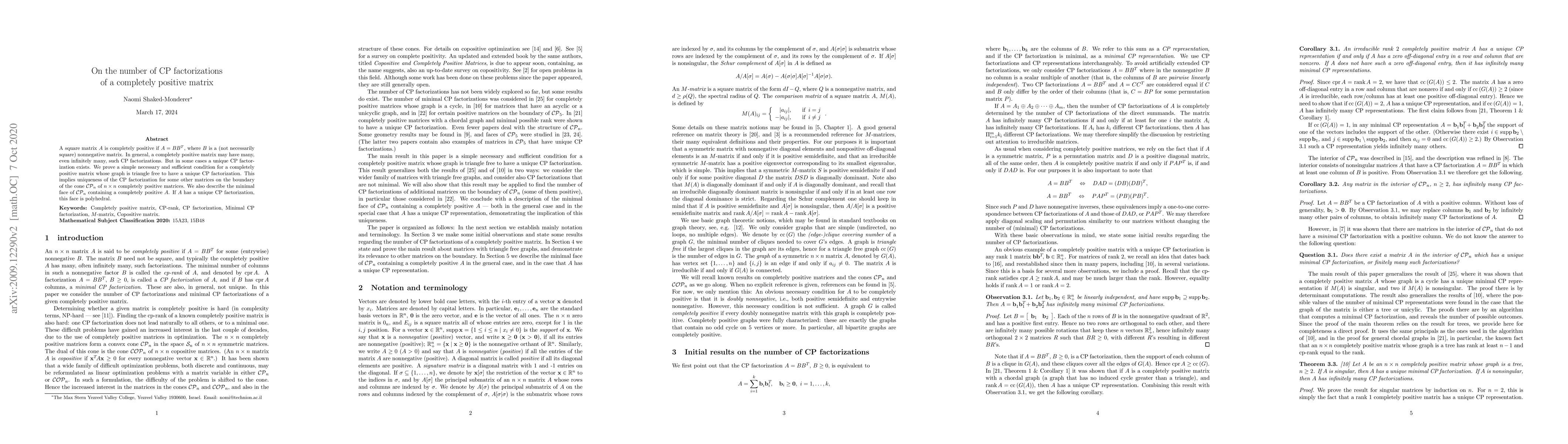 A square matrix $A$ is completely positive if $A=BB^T$, where $B$ is a (not necessarily square) nonnegative matrix. In general, a completely positive matrix may have many, even infinitely many, such CP factorizations. But in some cases a unique CP factorization exists. We prove a simple necessary and sufficient condition for a completely positive matrix whose graph is triangle free to have a unique CP factorization. This implies uniqueness of the CP factorization for some other matrices on the boundary of the cone $\mathcal{CP}_n$ of $n\times n$ completely positive matrices. We also describe the minimal face of $\mathcal{CP}_n$ containing a completely positive $A$. If $A$ has a unique CP factorization, this face is polyhedral.