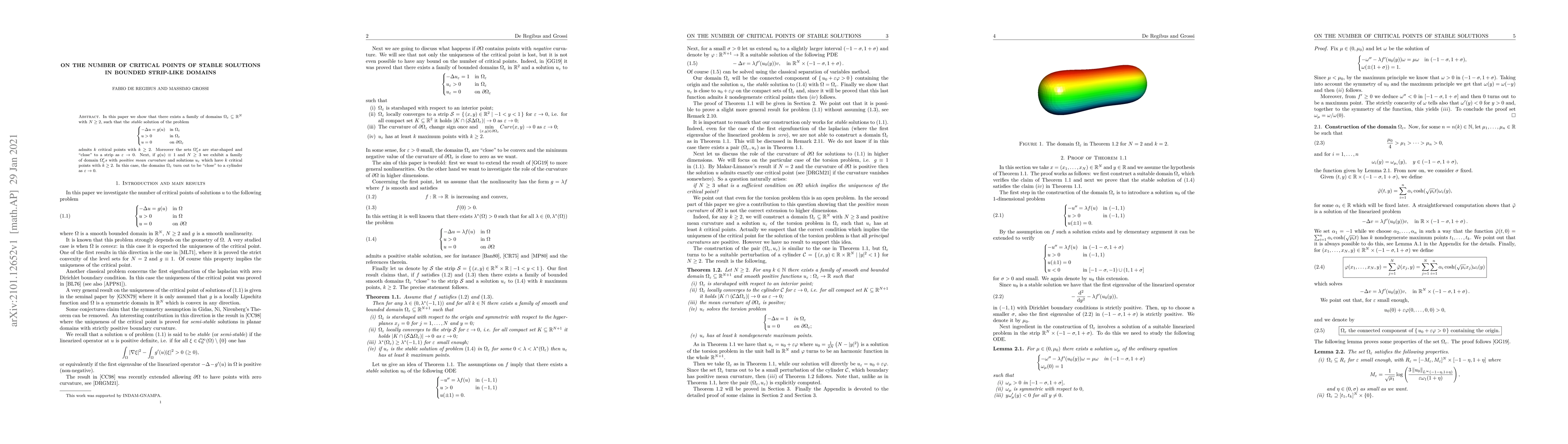 In this paper we show that there exists a family of domains $\Omega_{\varepsilon}\subseteq\mathbb{R}^N$ with $N\ge2$, such that the $stable$ solution of the problem \[ \begin{cases} -\Delta u= g(u)&\hbox{in }\Omega_\varepsilon\\ u>0&\hbox{in }\Omega_\varepsilon\\ u=0&\hbox{on }\partial\Omega_\varepsilon \end{cases} \] admits $k$ critical points with $k\ge2$. Moreover the sets $\Omega_\varepsilon's$ are star-shaped and "close" to a strip as $\varepsilon\to0$. Next, if $g(u)\equiv1$ and $N\ge3$ we exhibit a family of domain $\Omega_\varepsilon's$ with $positive$ $mean$ $curvature$ and solutions $u_\varepsilon $ which have $k$ critical points with $k\ge2$. In this case, the domains $\Omega_\varepsilon $ turn out to be "close" to a cylinder as $\varepsilon\to0$.