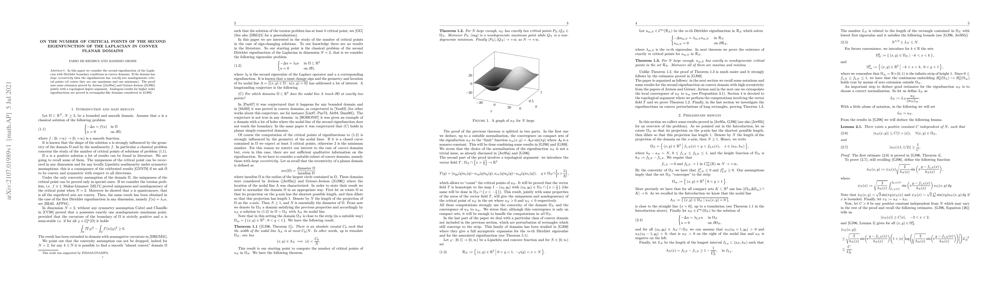 This paper investigates the second eigenfunction of the Laplacian in convex planar domains, showing that domains with large eccentricity have exactly two nondegenerate critical points. The proof combines estimates from Jerison and Grieser-Jerison with a topological degree argument.