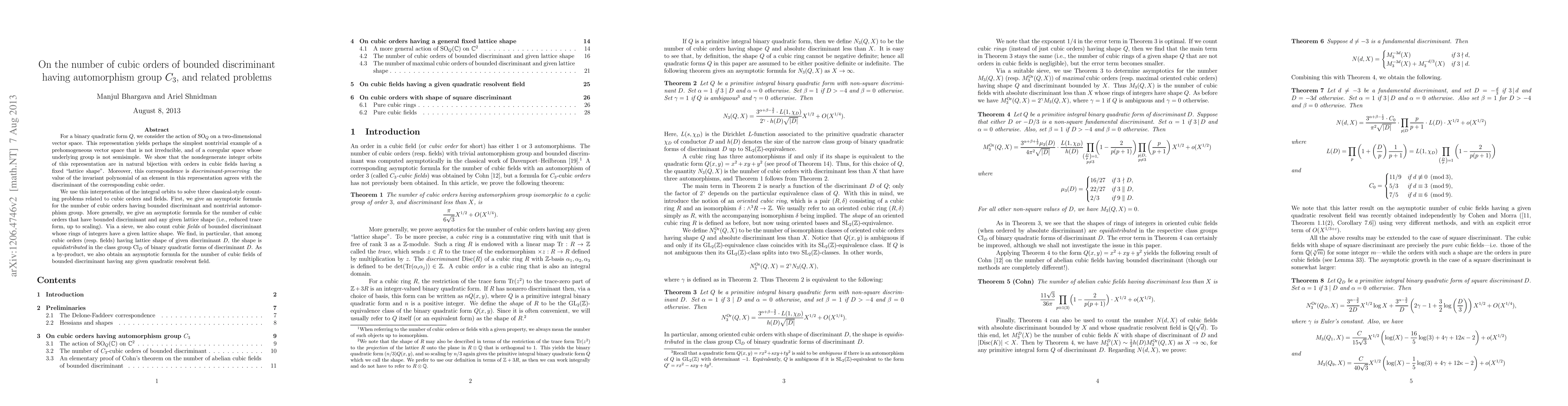This paper studies the number of cubic orders with a bounded discriminant and a specific automorphism group, establishing a bijection between nondegenerate integer orbits of a representation and these orders. The authors provide asymptotic formulas for counting cubic orders and fields with bounded discriminant and specific lattice shapes, showing equidistribution in the class group.