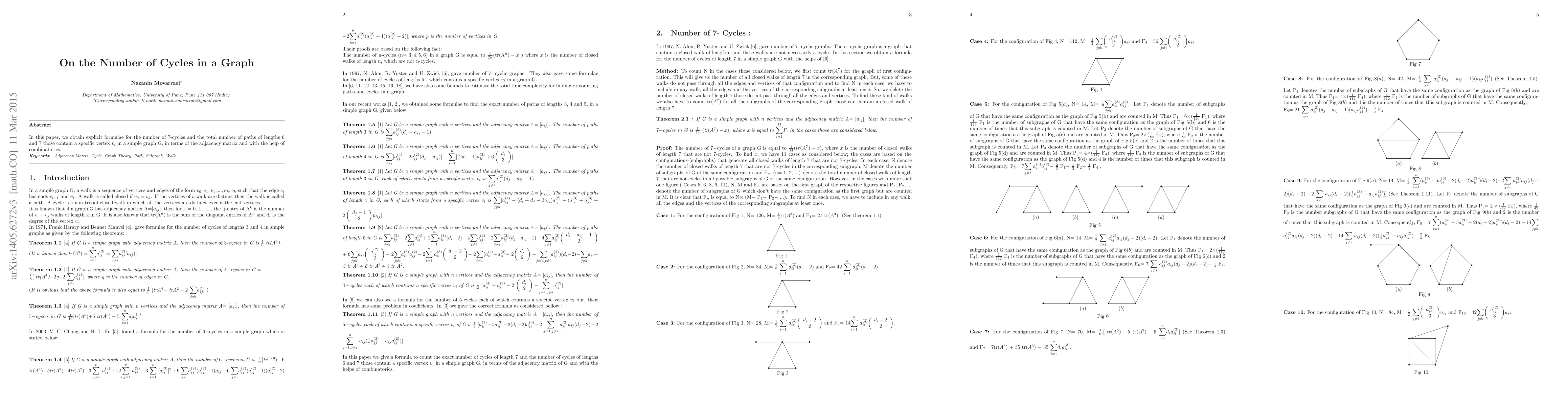 The paper provides explicit formulae for counting 7-cycles and paths of lengths 6 and 7 containing a specific vertex in a graph, using combinatorics and the adjacency matrix.
