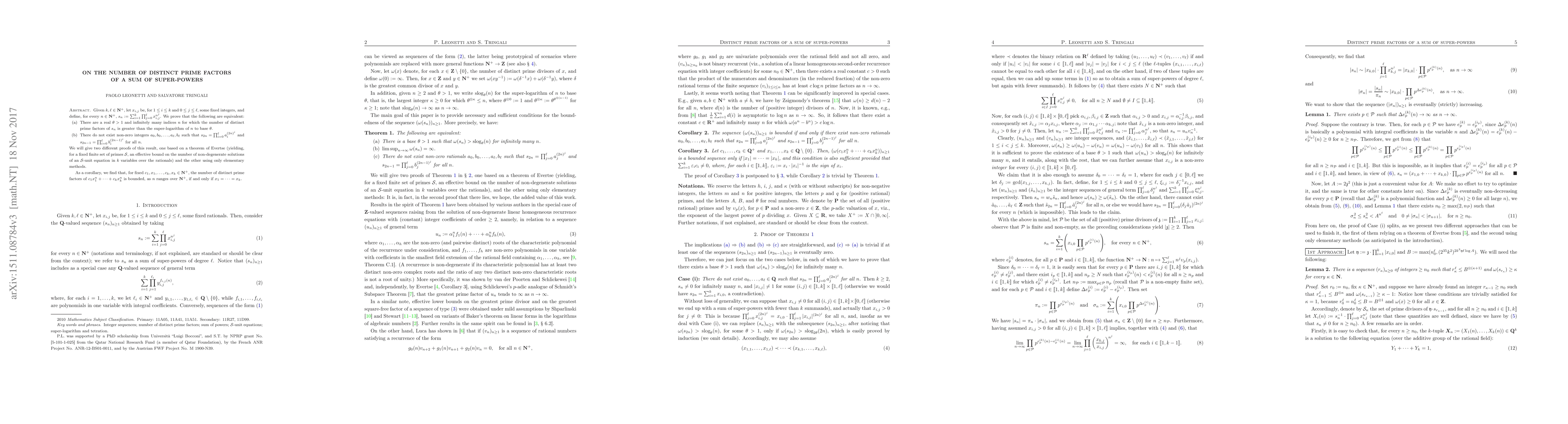 Given $k, \ell \in {\bf N}^+$, let $x_{i,j}$ be, for $1 \le i \le k$ and $0 \le j \le \ell$, some fixed integers, and define, for every $n \in {\bf N}^+$, $s_n := \sum_{i=1}^k \prod_{j=0}^\ell x_{i,j}^{n^j}$. We prove that the following are equivalent: (a) There are a real $\theta > 1$ and infinitely many indices $n$ for which the number of distinct prime factors of $s_n$ is greater than the super-logarithm of $n$ to base $\theta$. (b) There do not exist non-zero integers $a_0,b_0,\ldots,a_\ell,b_\ell $ such that $s_{2n}=\prod_{i=0}^\ell a_i^{(2n)^i}$ and $s_{2n-1}=\prod_{i=0}^\ell b_i^{(2n-1)^i}$ for all $n$. We will give two different proofs of this result, one based on a theorem of Evertse (yielding, for a fixed finite set of primes $\mathcal S$, an effective bound on the number of non-degenerate solutions of an $\mathcal S$-unit equation in $k$ variables over the rationals) and the other using only elementary methods. As a corollary, we find that, for fixed $c_1, x_1, \ldots,c_k, x_k \in \mathbf N^+$, the number of distinct prime factors of $c_1 x_1^n+\cdots+c_k x_k^n$ is bounded, as $n$ ranges over $\mathbf N^+$, if and only if $x_1=\cdots=x_k$.