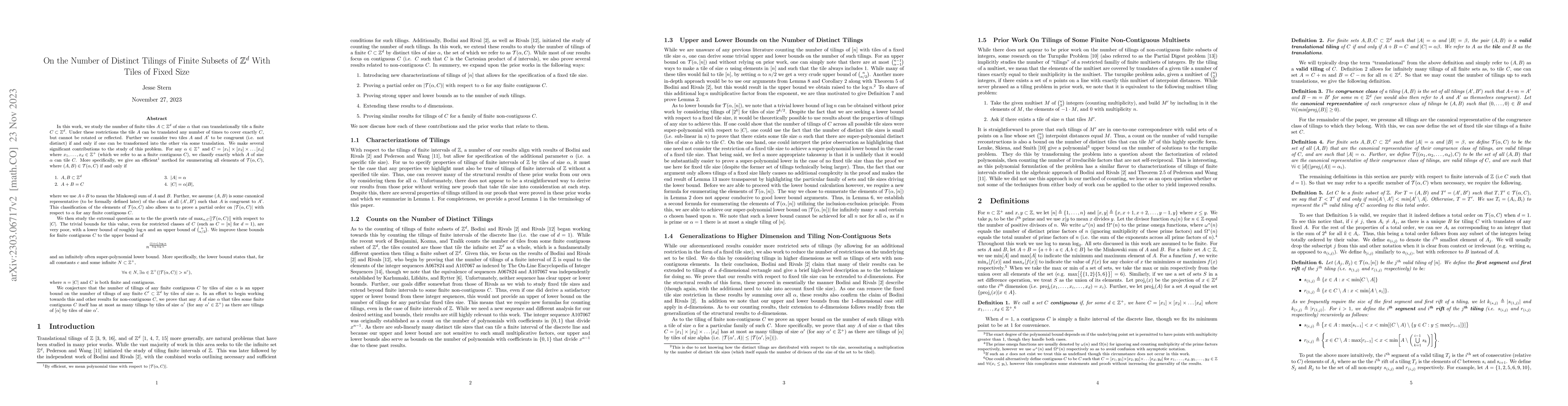 This paper investigates the enumeration of distinct tilings of finite subsets of $\mathbb{Z}^{d}$ using tiles of fixed size $\alpha$. It provides an efficient method for counting all such tilings and proves a partial order on their count with respect to $\alpha$. The study also improves bounds on the growth rate of the maximum number of tilings with respect to the size of the subset, and conjectures a relationship between tilings of different finite subsets.