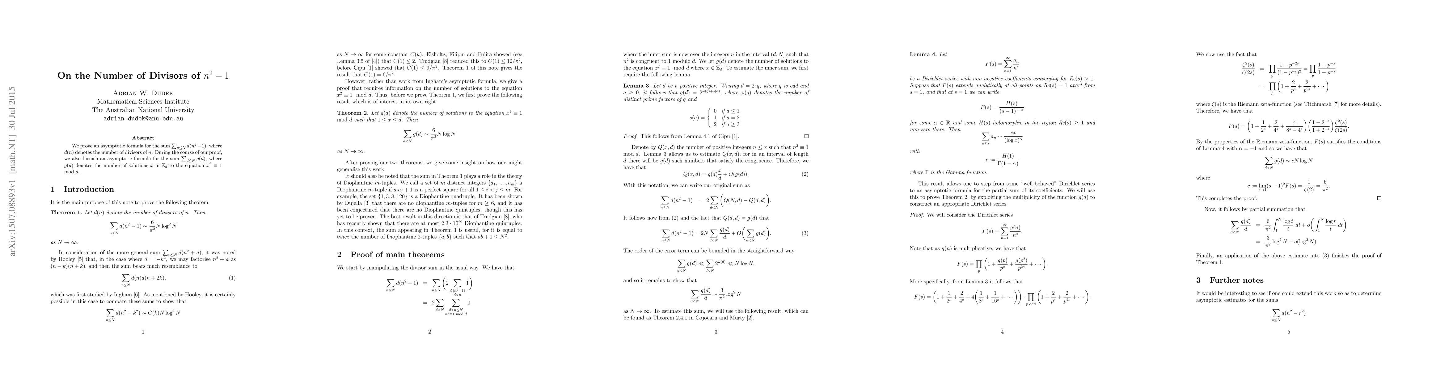 This paper proves an asymptotic formula for the sum of divisors of $n^2 - 1$, relating it to the number of solutions to $x^2 mod d = 1$ for various moduli $d$. The findings have implications for understanding divisor sums and their connections to modular arithmetic.