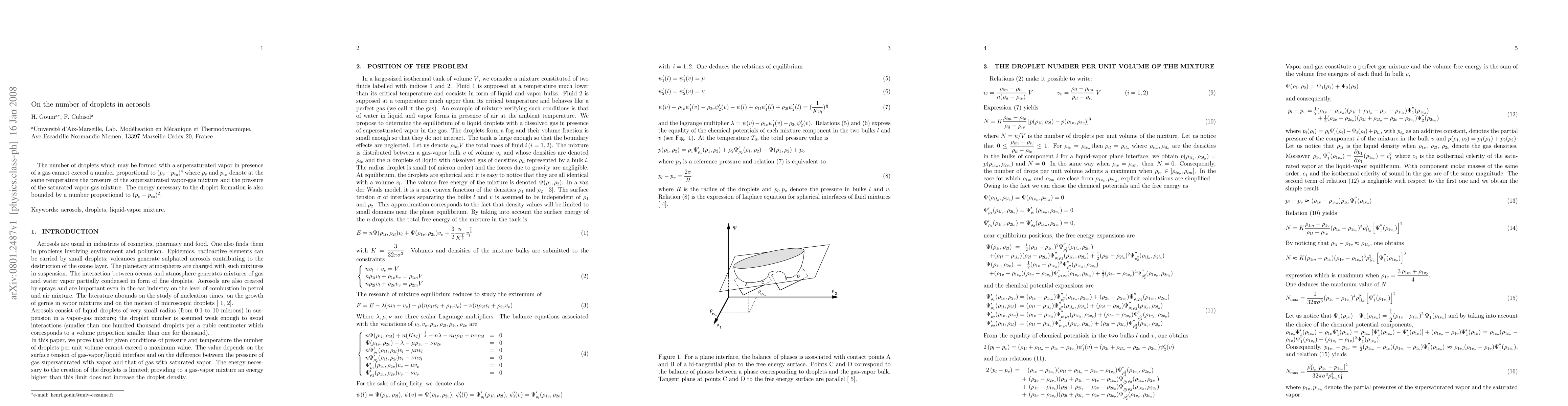 The research paper finds that the number of droplets formed in aerosols is bounded by a proportional relationship to (pv-pvo)^4, where pv and pvo are pressures of saturated vapor-gas mixtures at the same temperature. The energy required for droplet formation is also limited by a relationship proportional to (pv-pvo)^2.