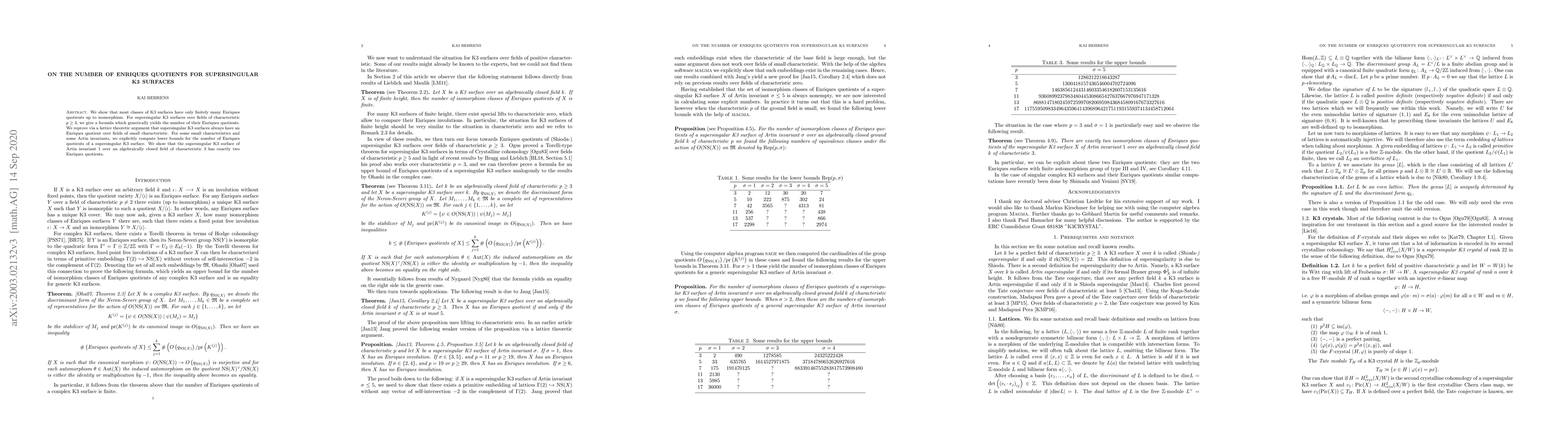 Summary: The paper demonstrates that most K3 surfaces have finitely many Enriques quotients, provides a formula for supersingular K3 surfaces in fields of characteristic $p \geq 3$ to determine their Enriques quotients, and computes explicit lower bounds for certain characteristics and Artin invariants, concluding that the supersingular K3 surface with Artin invariant $1$ in characteristic $3$ has exactly two Enriques quotients.