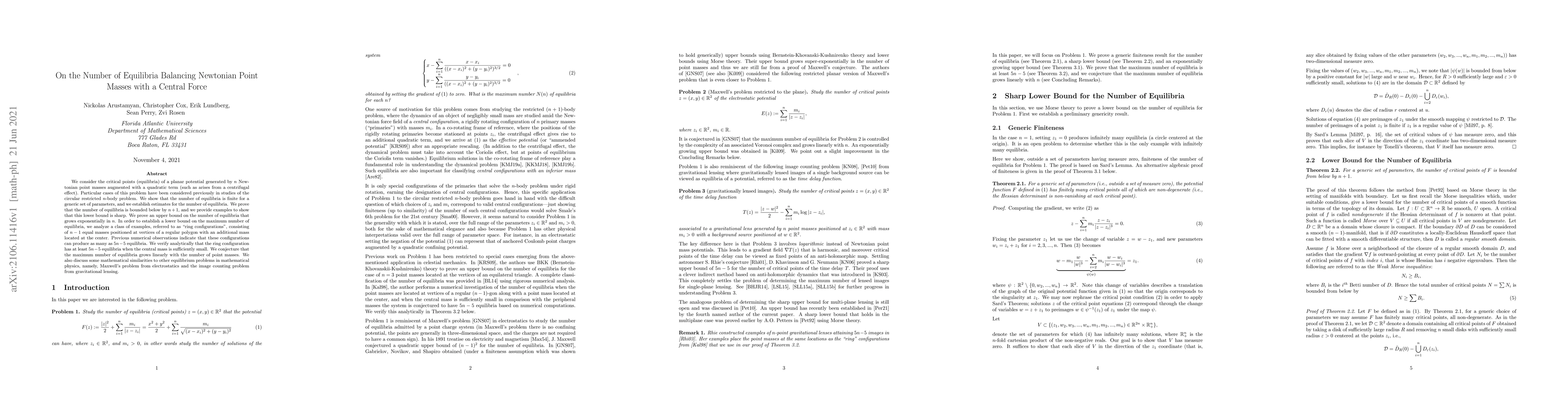 We consider the critical points (equilibria) of a planar potential generated by $n$ Newtonian point masses augmented with a quadratic term (such as arises from a centrifugal effect). Particular cases of this problem have been considered previously in studies of the circular restricted $n$-body problem. We show that the number of equilibria is finite for a generic set of parameters, and we establish estimates for the number of equilibria. We prove that the number of equilibria is bounded below by $n+1$, and we provide examples to show that this lower bound is sharp. We prove an upper bound on the number of equilibria that grows exponentially in $n$. In order to establish a lower bound on the maximum number of equilibria, we analyze a class of examples, referred to as ``ring configurations'', consisting of $n-1$ equal masses positioned at vertices of a regular polygon with an additional mass located at the center. Previous numerical observations indicate that these configurations can produce as many as $5n-5$ equilibria. We verify analytically that the ring configuration has at least $5n-5$ equilibria when the central mass is sufficiently small. We conjecture that the maximum number of equilibria grows linearly with the number of point masses. We also discuss some mathematical similarities to other equilibrium problems in mathematical physics, namely, Maxwell's problem from electrostatics and the image counting problem from gravitational lensing.