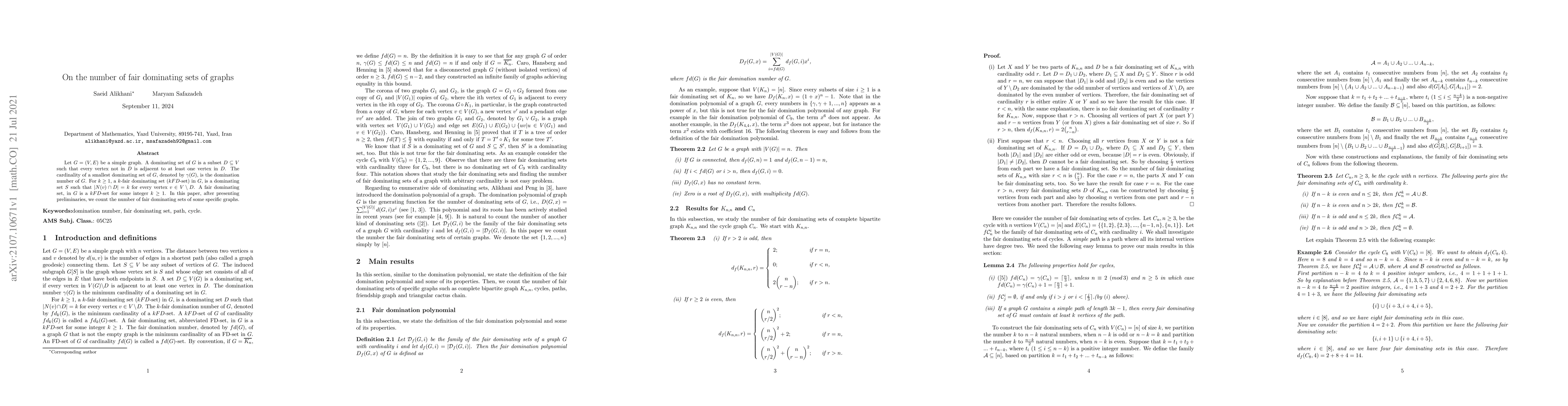 The paper introduces methods for counting fair dominating sets in specific graph types, extending previous work on domination polynomials and providing new results for cycle graphs, complete bipartite graphs, path graphs, friendship graphs, and triangular cactus graphs.