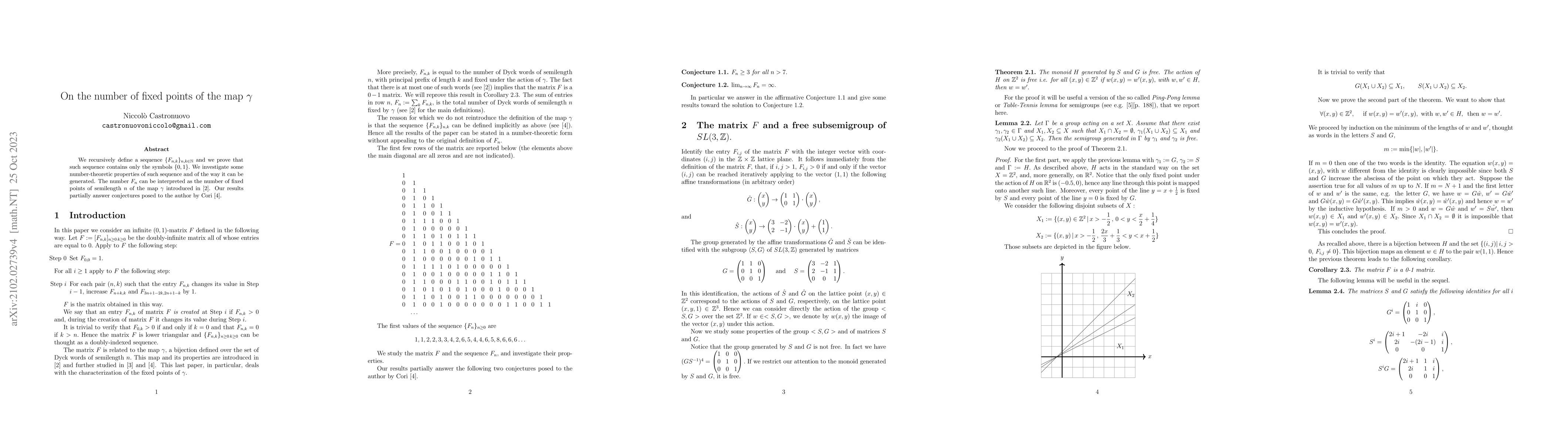 We recursively define a sequence $\{F_{n,k}\}_{n,k\in\mathbb N }$ and we prove that such sequence contains only the symbols $\{0,1\}.$ We investigate some number-theoretic properties of such sequence and of the way it can be generated. The number $F_n$ can be interpreted as the number of fixed points of semilength $n$ of the map $\gamma$ introduced by Barnabei et al. Our results partially answer conjectures posed by Cori et al.