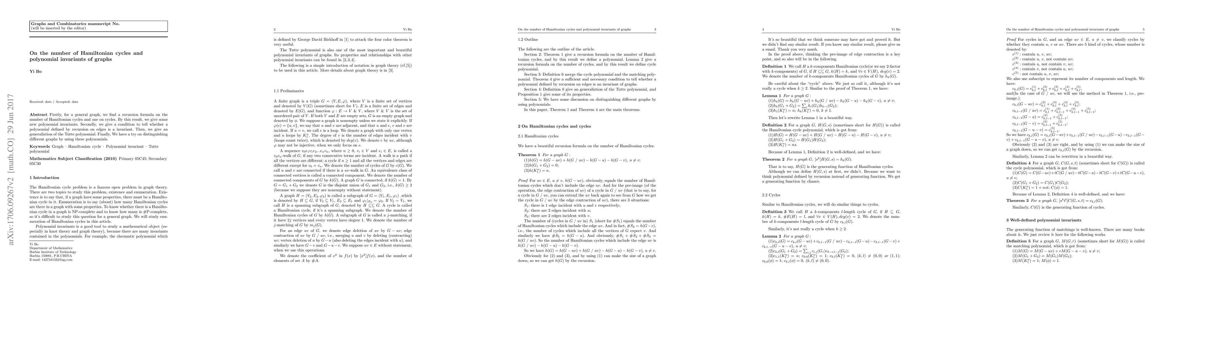 Firstly, for a general graph, we find a recursion formula on the number of Hamiltonian cycles and one on cycles. By this result, we give some new polynomial invariants. Secondly, we give a condition to tell whether a polynomial defined by recursion on edges is a invariant. Then, we give an generaliztion of the Tutte polynomial. Finally, We have a try on distinguishing different graphs by using these polynomials.