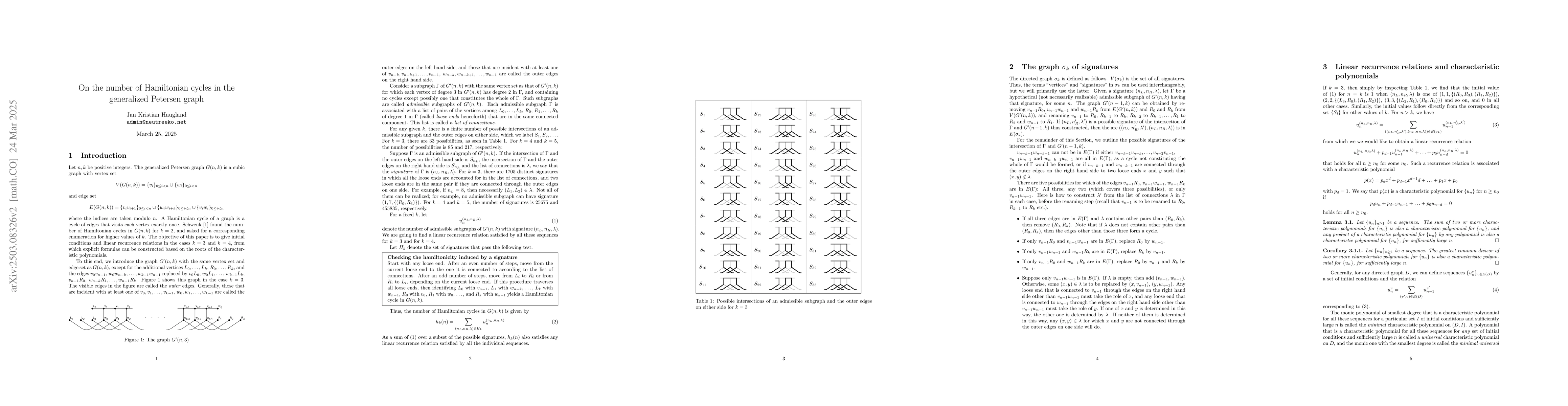 This work extends Schwenk's findings on Hamiltonian cycles in $G(n, 2)$ by providing initial conditions and recurrence relations for larger values of $k$, which contributes to a better understanding of the structure and properties of generalized Petersen graphs.