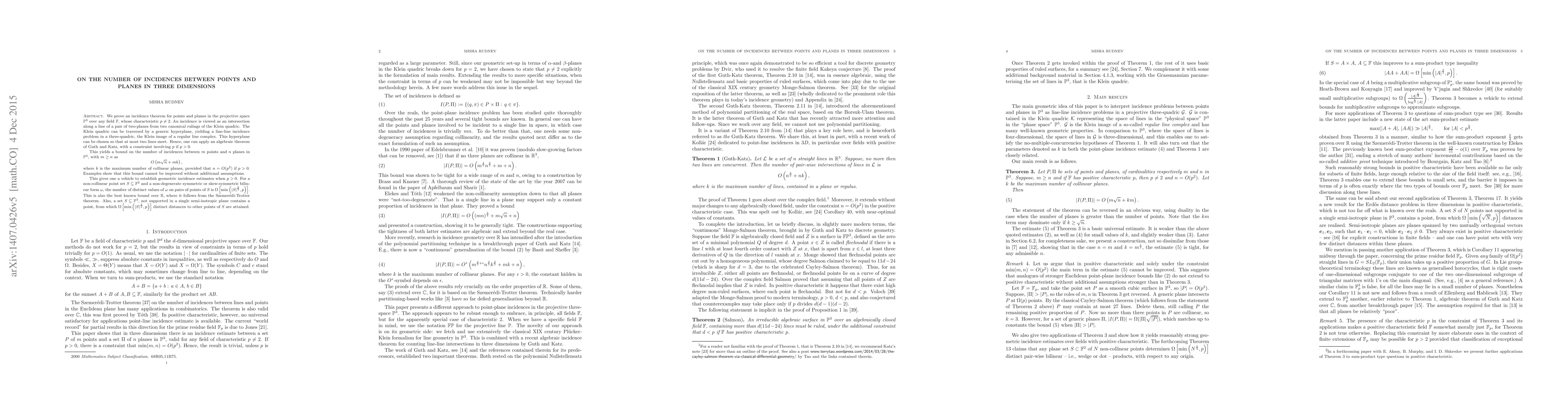 We prove an incidence theorem for points and planes in the projective space $\mathbb P^3$ over any field $\mathbb F$, whose characteristic $p\neq 2.$ An incidence is viewed as an intersection along a line of a pair of two-planes from two canonical rulings of the Klein quadric. The Klein quadric can be traversed by a generic hyperplane, yielding a line-line incidence problem in a three-quadric, the Klein image of a regular line complex. This hyperplane can be chosen so that at most two lines meet. Hence, one can apply an algebraic theorem of Guth and Katz, with a constraint involving $p$ if $p>0$. This yields a bound on the number of incidences between $m$ points and $n$ planes in $\mathbb P^3$, with $m\geq n$ as $$O\left(m\sqrt{n}+ m k\right),$$ where $k$ is the maximum number of collinear planes, provided that $n=O(p^2)$ if $p>0$. Examples show that this bound cannot be improved without additional assumptions. This gives one a vehicle to establish geometric incidence estimates when $p>0$. For a non-collinear point set $S\subseteq \mathbb F^2$ and a non-degenerate symmetric or skew-symmetric bilinear form $\omega$, the number of distinct values of $\omega$ on pairs of points of $S$ is $\Omega\left[\min\left(|S|^{\frac{2}{3}},p\right)\right]$. This is also the best known bound over $\mathbb R$, where it follows from the Szemer\'edi-Trotter theorem. Also, a set $S\subseteq \mathbb F^3$, not supported in a single semi-isotropic plane contains a point, from which $\Omega\left[\min\left(|S|^{\frac{1}{2}},p\right)\right]$ distinct distances to other points of $S$ are attained.