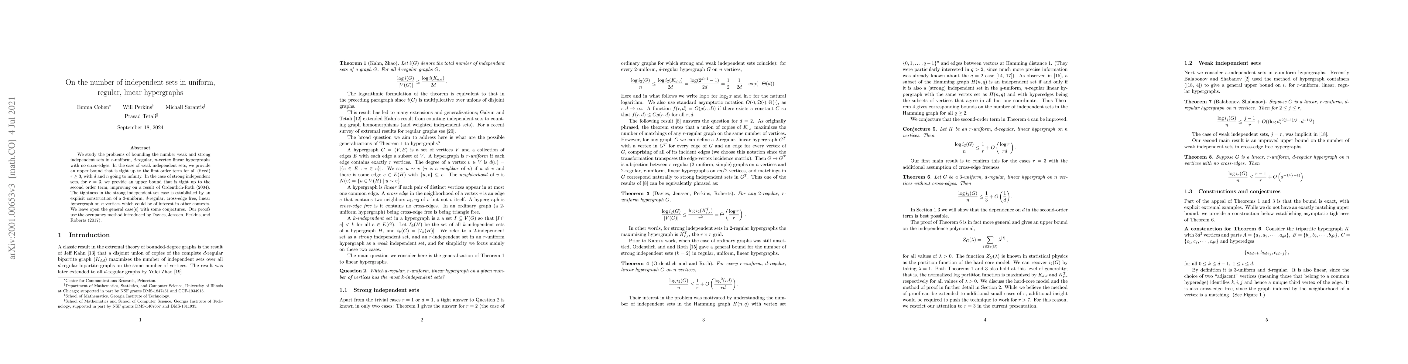 This paper studies the number of independent sets in uniform, regular, linear hypergraphs, providing upper bounds for weak and strong independent sets that improve on previous results.