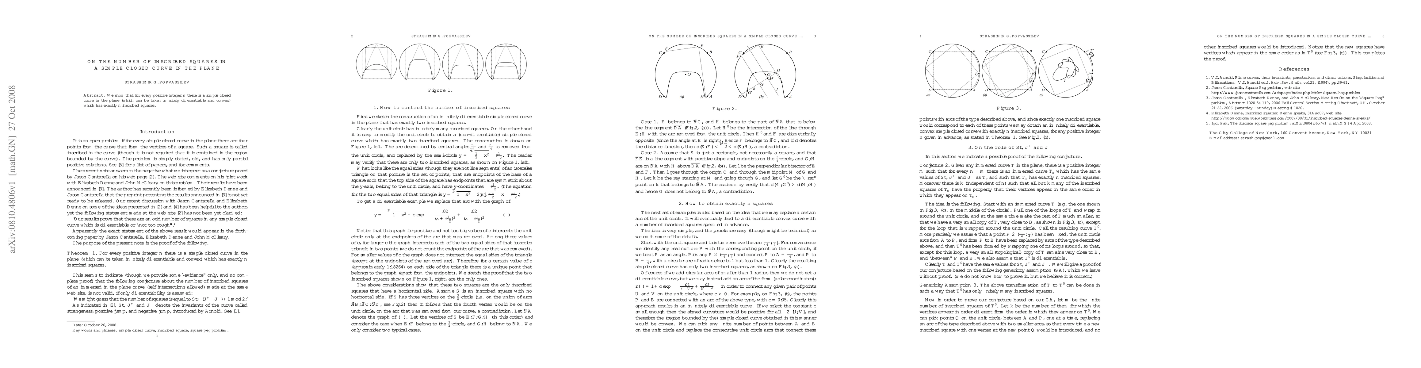 We show that for every positive integer n there is a simple closed curve in the plane (which can be taken infinitely differentiable and convex) which has exactly n inscribed squares.