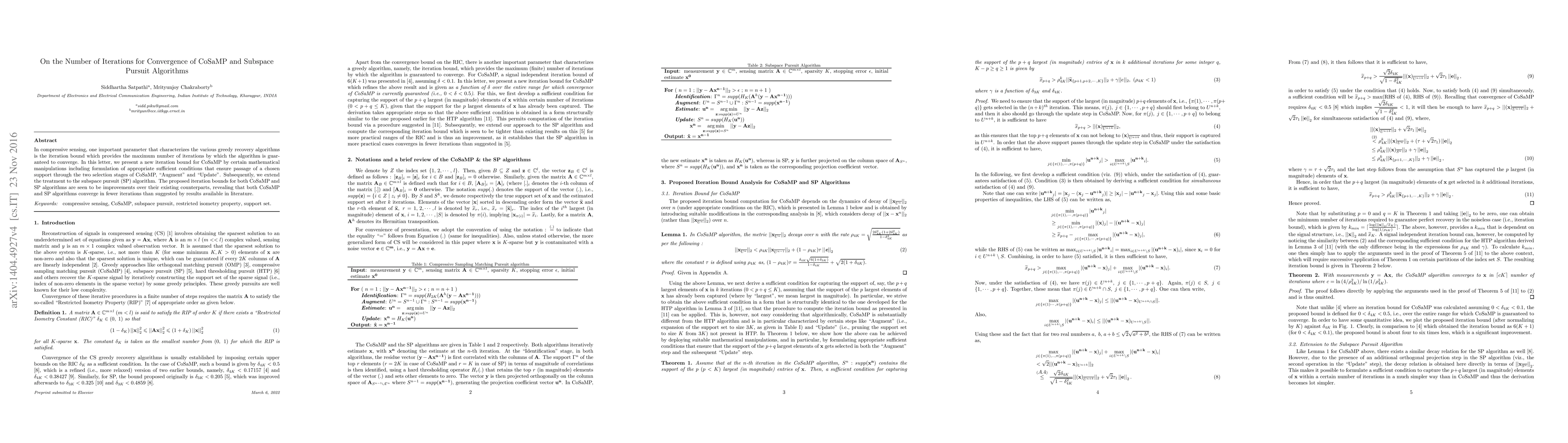 This paper presents new iteration bounds for CoSaMP and Subspace Pursuit algorithms in compressive sensing, showing that both algorithms converge in fewer iterations than previously established results. The improved bounds are derived through mathematical manipulations and sufficient conditions for support selection.