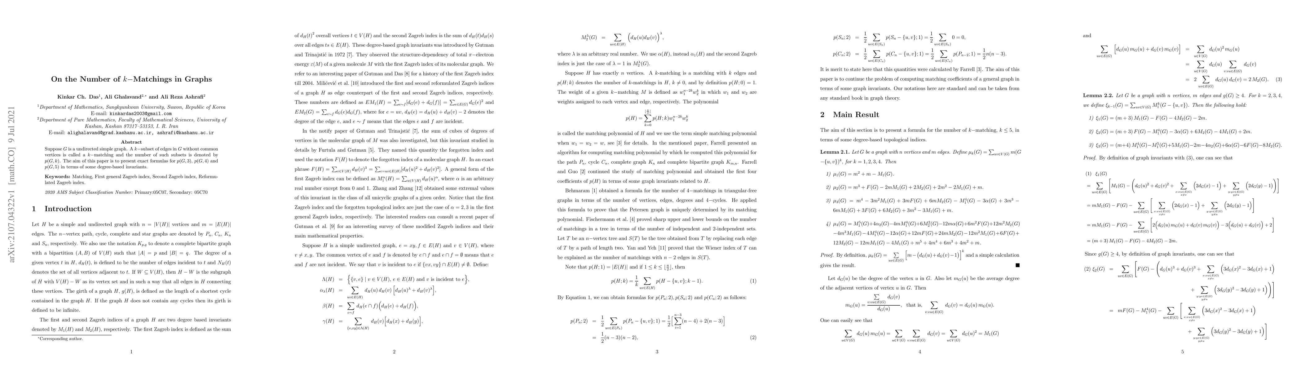 Suppose $G$ is a undirected simple graph. A $k-$subset of edges in $G$ without common vertices is called a $k-$matching and the number of such subsets is denoted by $p(G,k)$. The aim of this paper is to present exact formulas for $p(G,3)$, $p(G,4)$ and $P(G,5)$ in terms of some degree-based invariants.
