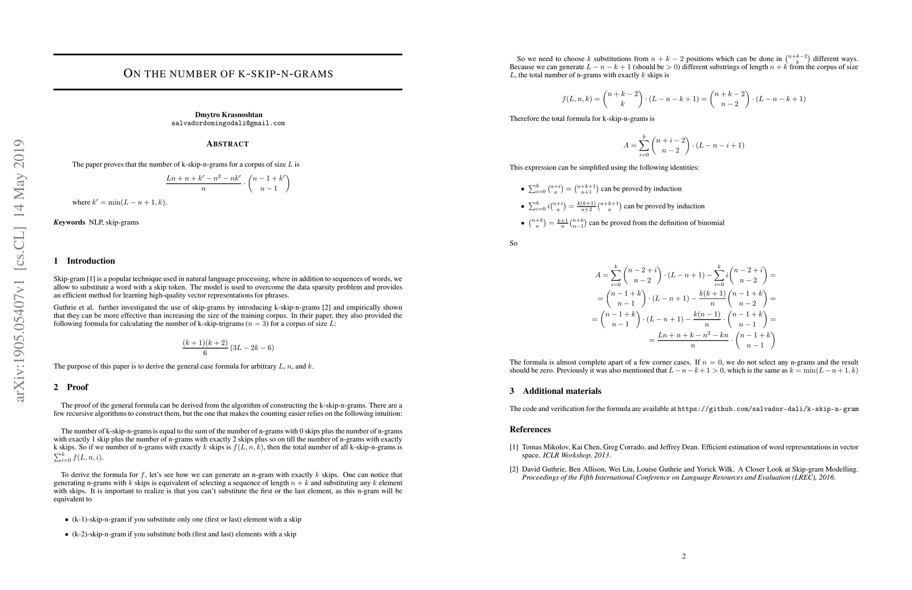 The paper proves that the number of k-skip-n-grams for a corpus of size $L$ is $$\frac{Ln + n + k' - n^2 - nk'}{n} \cdot \binom{n-1+k'}{n-1}$$ where $k' = \min(L - n + 1, k)$.