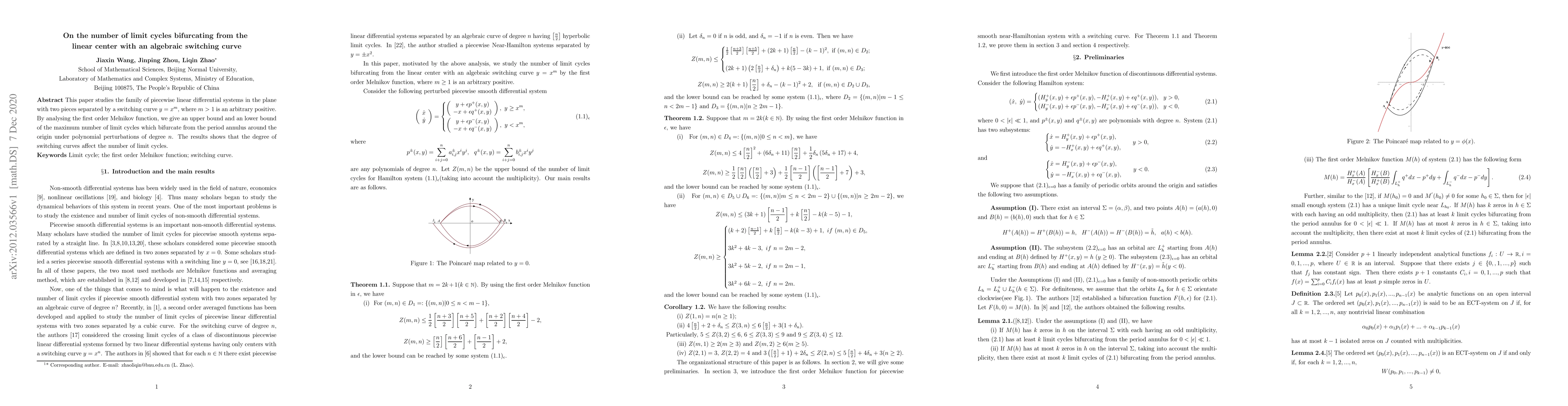 The paper analyzes how many limit cycles can form from a linear center in a plane with an algebraic switching curve, finding that the degree of switching curves affects the number of limit cycles.