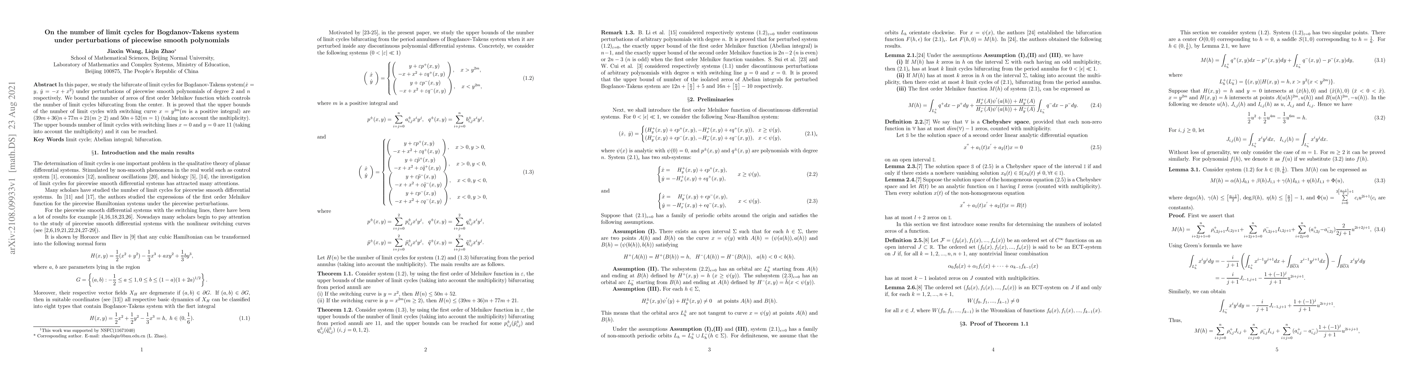 This paper investigates the bifurcation of limit cycles in the Bogdanov-Takens system under perturbations by piecewise smooth polynomials. It establishes upper bounds for the number of limit cycles, showing that these depend on the degree of the polynomials and the presence of switching curves.