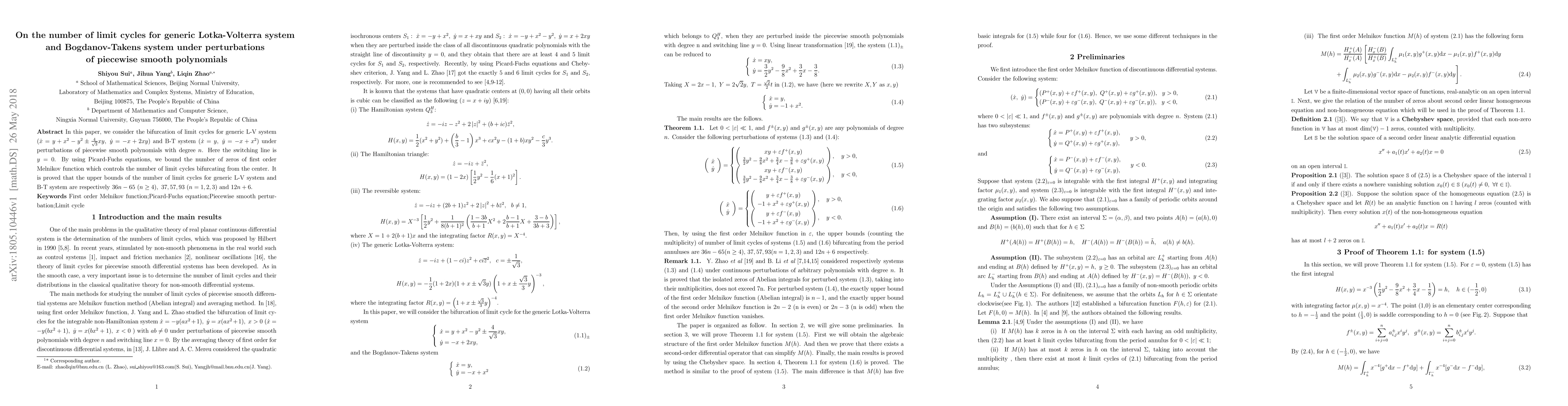 This paper investigates the bifurcation of limit cycles in generic Lotka-Volterra and Bogdanov-Takens systems under perturbations by piecewise smooth polynomials. Using Picard-Fuchs equations and the first order Melnikov method, it establishes upper bounds for the number of limit cycles, showing $36n-65$ for the L-V system and $12n+6$ for the B-T system for $n\geq4$, with specific values for lower $n$.
